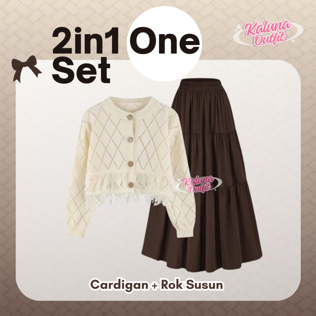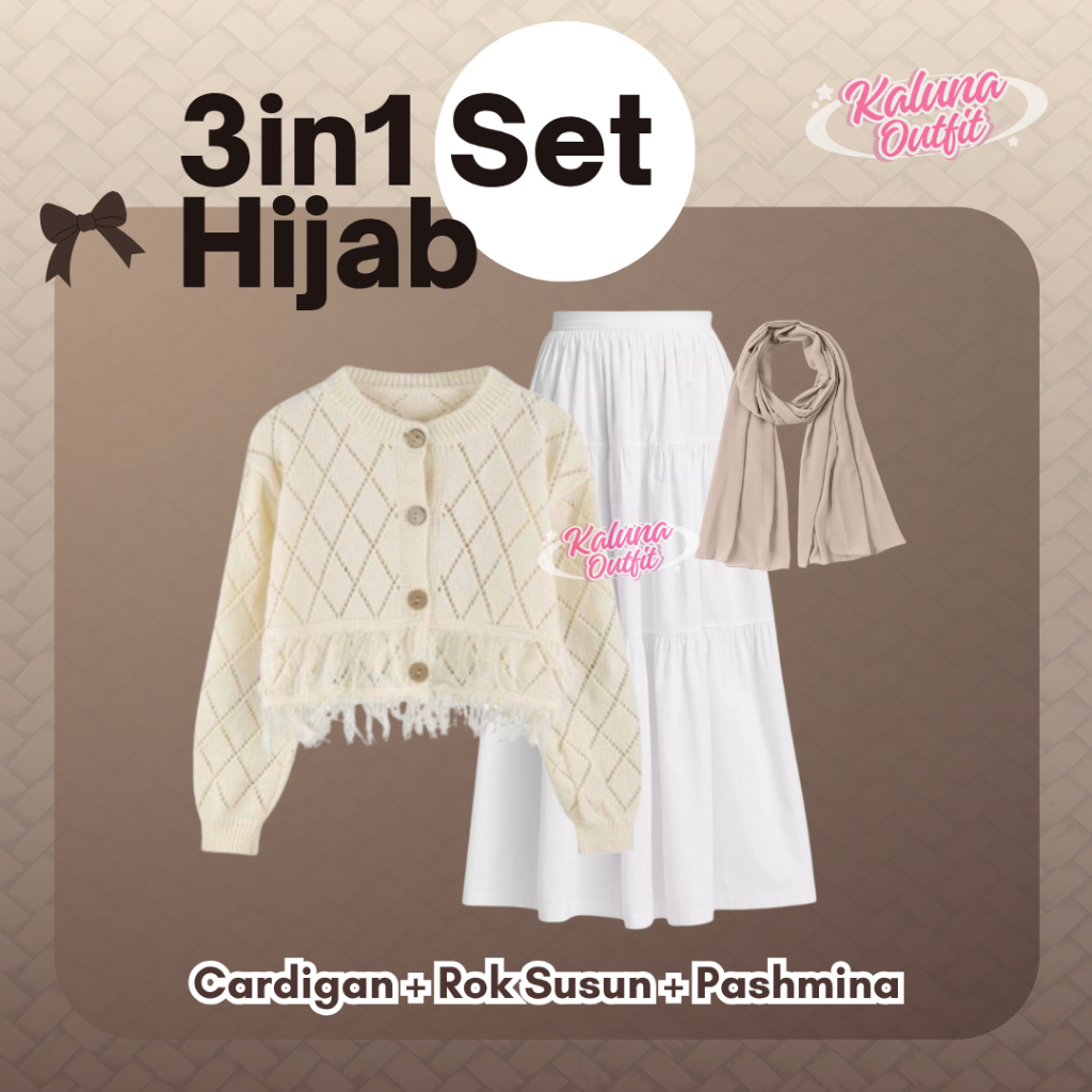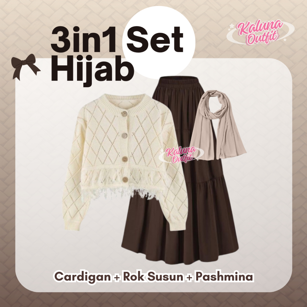 One Set Setelan 3in1 Wanita ( Cardigan Rawis Rajut, Rok Susun Hyget, Pashmina Ceruty Beige ) KO2N