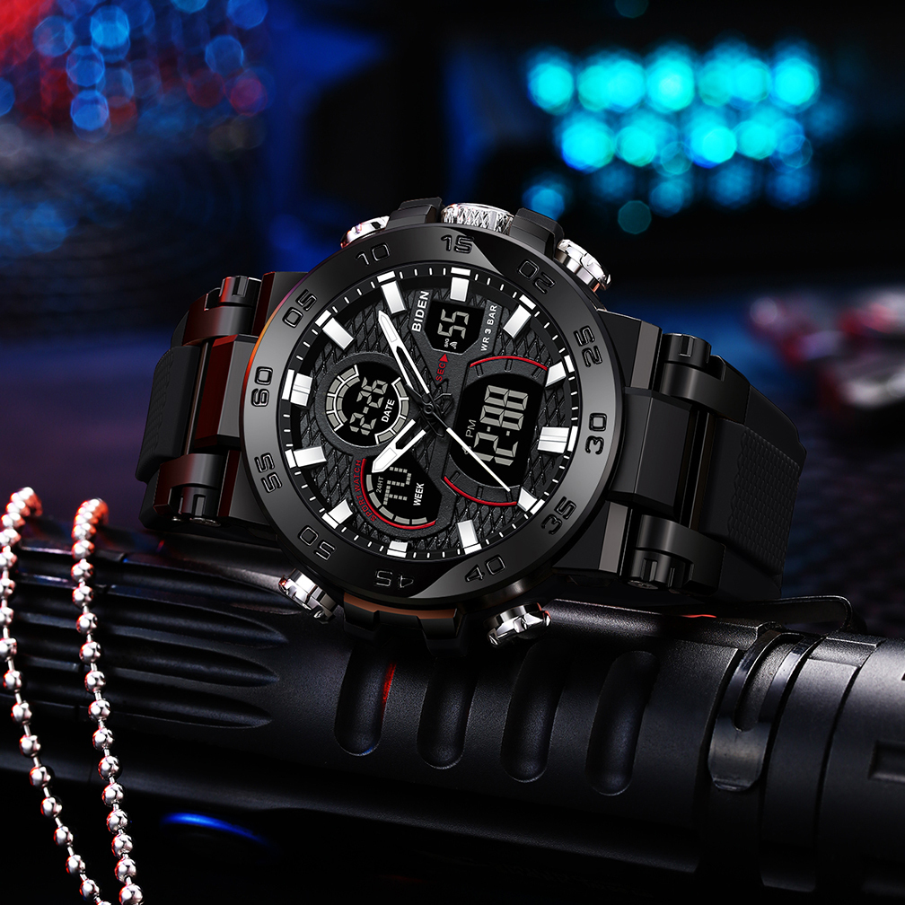 BIDEN Jam Tangan Pria Anti Air Original Digital&Analog Bercahaya Alarm Tali Silikon Jam Tangan Cowok Olahraga