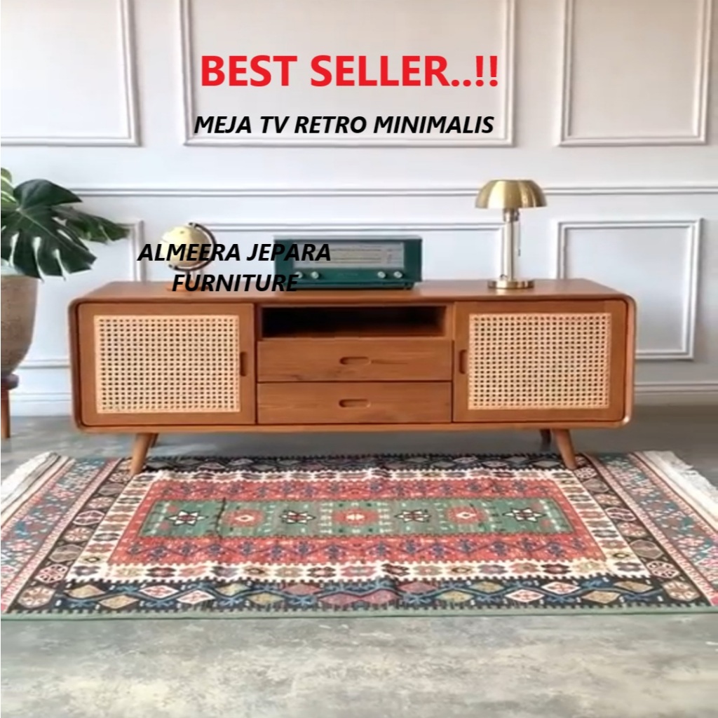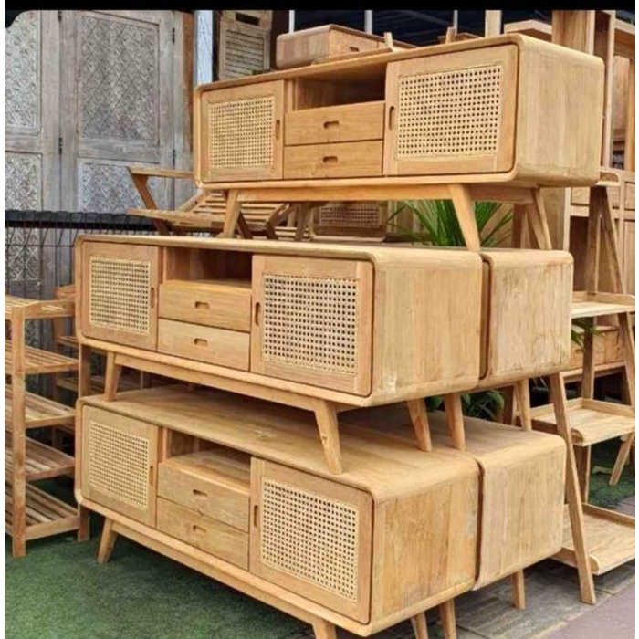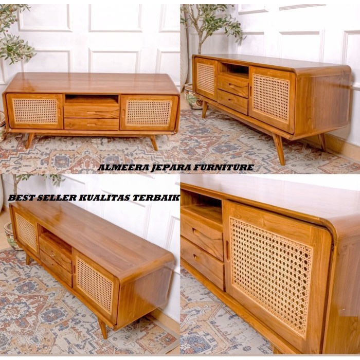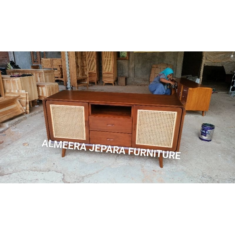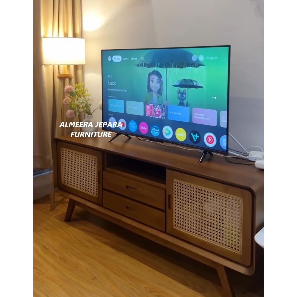 Best Seller Bufet TV Jati Minimalis Retro Pintu Rotan Meja TV Kayu Jati Rak TV Buffet TV Minimalis