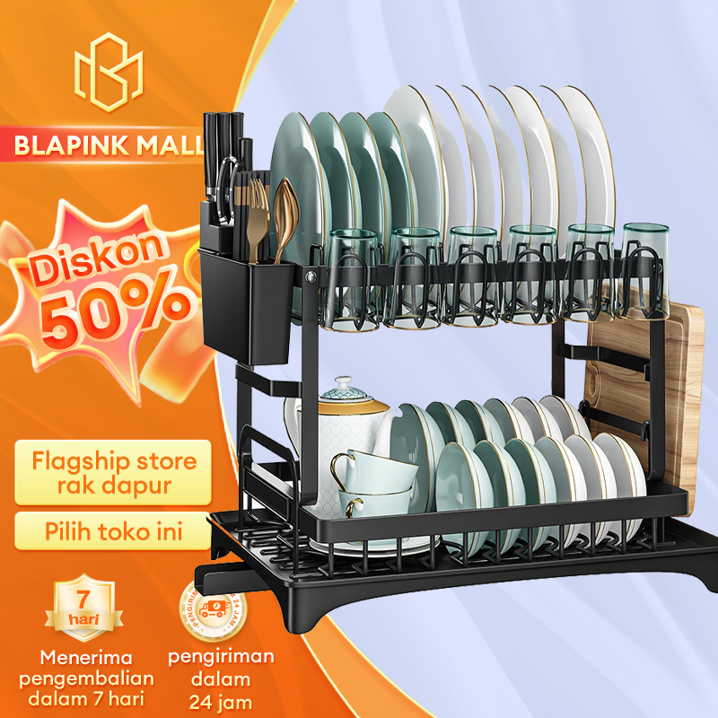 Rak Piring Dapur Stainless Steel 2 Tingkat Rak Pengering Piring Rak Mangkuk Piring