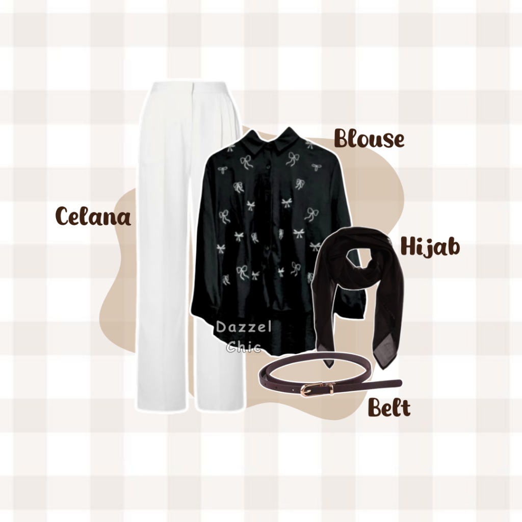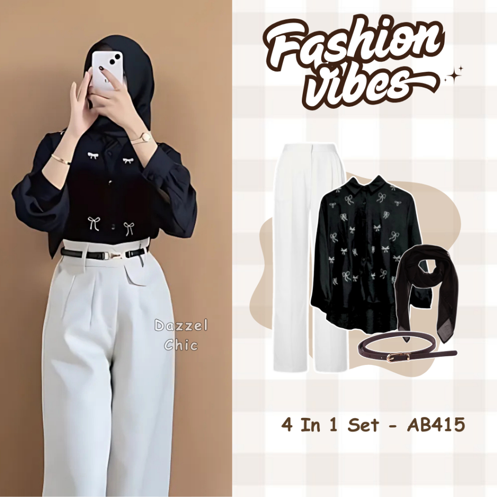 DazzelChic OOTD 4IN1 Setelan Wanita Korean Style ( Blouse Pita + Hijab + Celana Knit + Belt ) Outfit Kekinian Terbaru - AB415