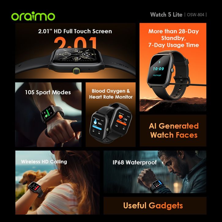 ORAIMO WATCH 5 LITE SMARTWATCH OSW-804 JAM TANGAN PINTAR LAYAR BESAR 2.01'' BLUETOOTH BATERAI TAHAN LAMA TAHAN AIR DEBU