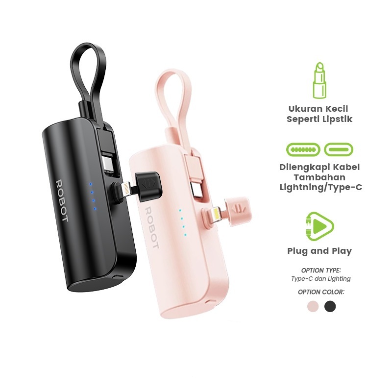 [Mall] ROBOT Powerbank Mini Fast Charging 4500mAh With Port and Cable Type C Lightning Stand Function Power bank Travel