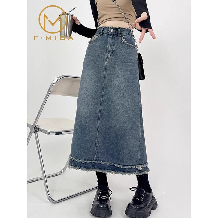 TERMURAH F·MIGA C108 Denim Rok Jeans Midi High Waist Wanita - Biru onomnc