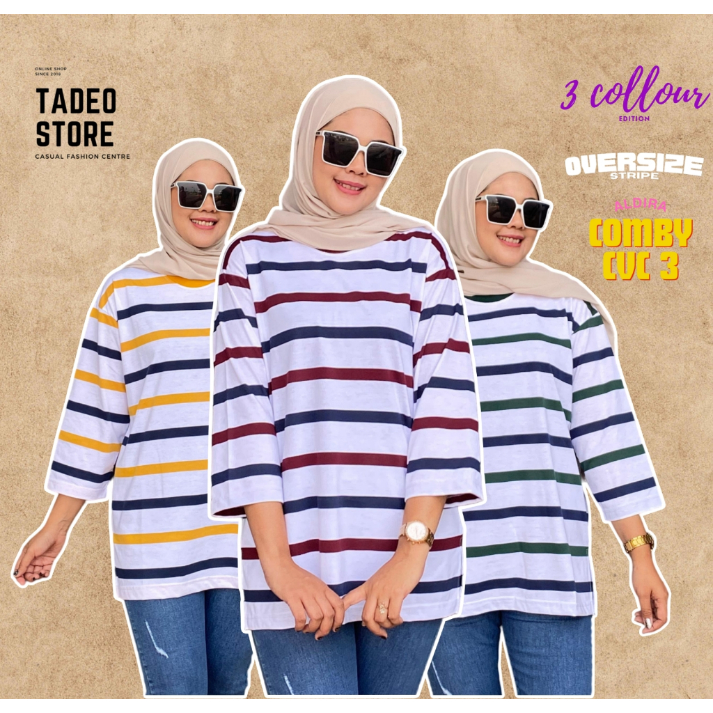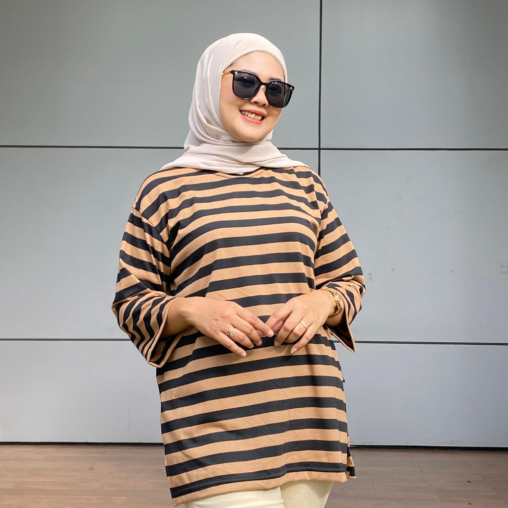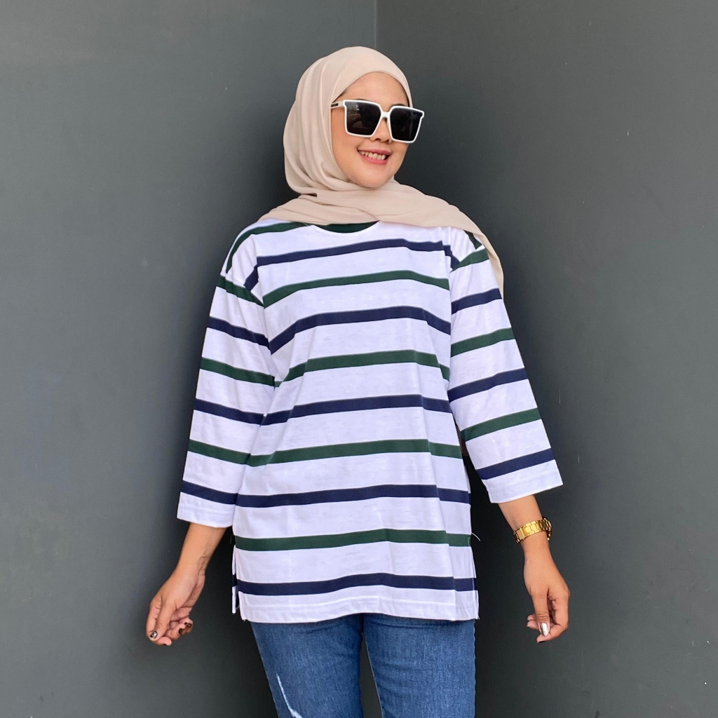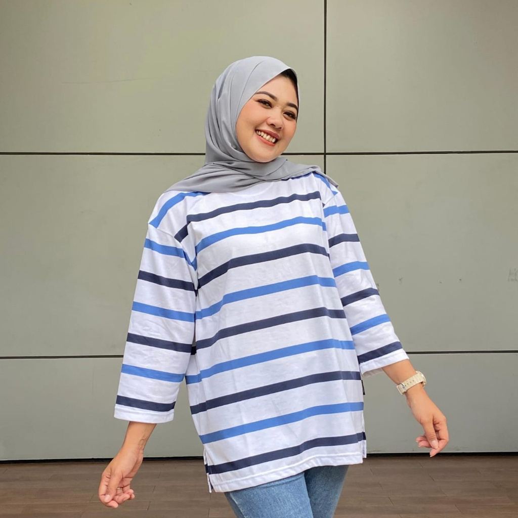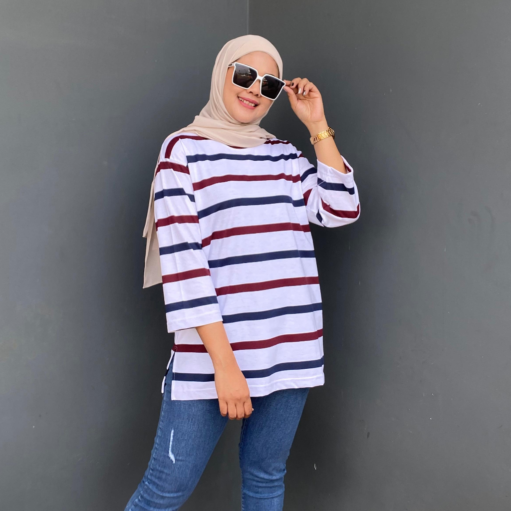 ALDIRA TERBARU BAJU BELANG WANITA GARIS KECIL 7 8 OVERSIZE GAYA IMUT LENGAN 3/4 WARNA TERBARU KAOS ATASAN LEBARAN WANITA SALUR TERLARIS