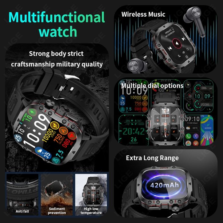 LIGE Jam Tangan Pintar Olahraga Tahan Air Panggilan Bluetooth Pria 420mAh Pemantauan Kesehatan IP68 Jam Tangan Pintar P