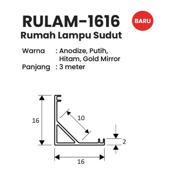 PREMIUM FULL Rumah Lampu LED Stripe Sudut Rulam 1616 Huben ( Anodize,Hitam,Gold,Putih) ecosg