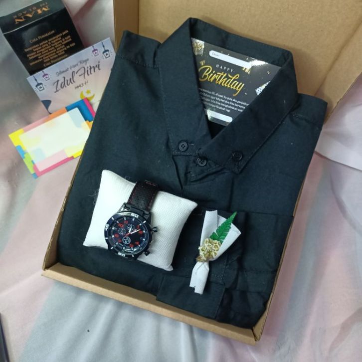Paket Hampers Kemeja Hitam Kaos Cowok Farpum Cowok Dompet Cowok Jam Tangan Kado Ulang Tahun Wisuda Anniversary