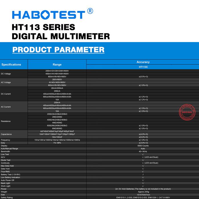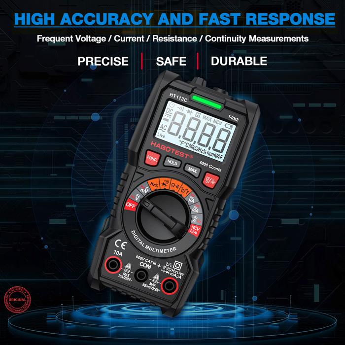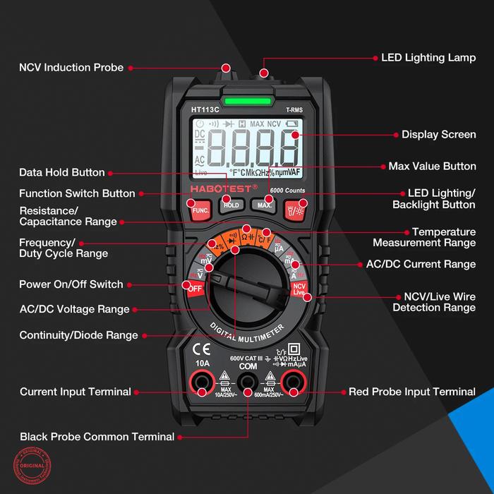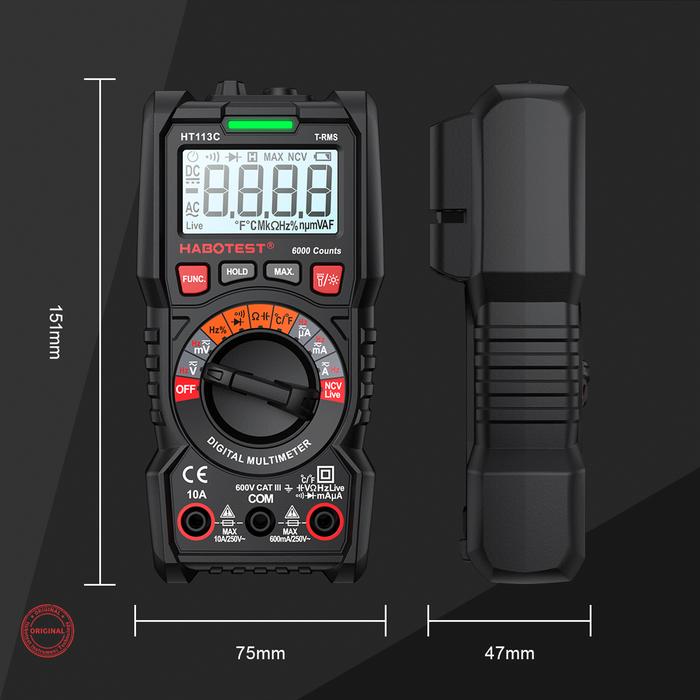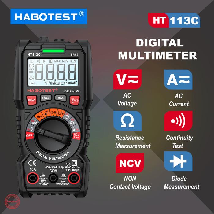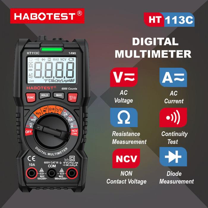 HABOTEST HT113C Multimeter Digital 600V AC DC True-RMS Multimeter Portabel NCV Voltmeter Ammeter Ohm - hitam