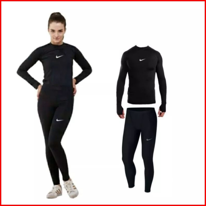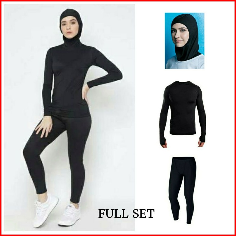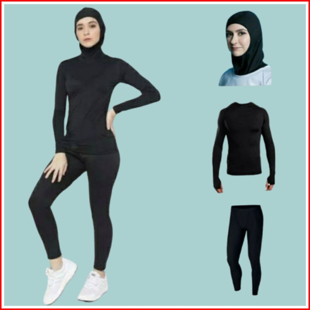 3 In 1 Base Layer Setelan Olahraga Wanita Hijab Manset Lengan Panjang Lubang Jari Celana Legging Panjang Dan Jilbab Musl