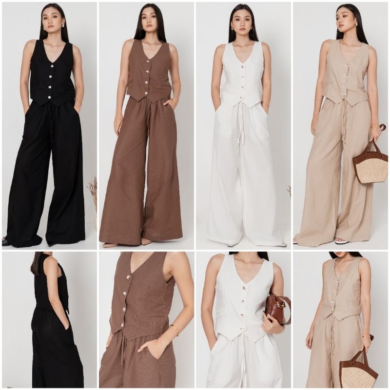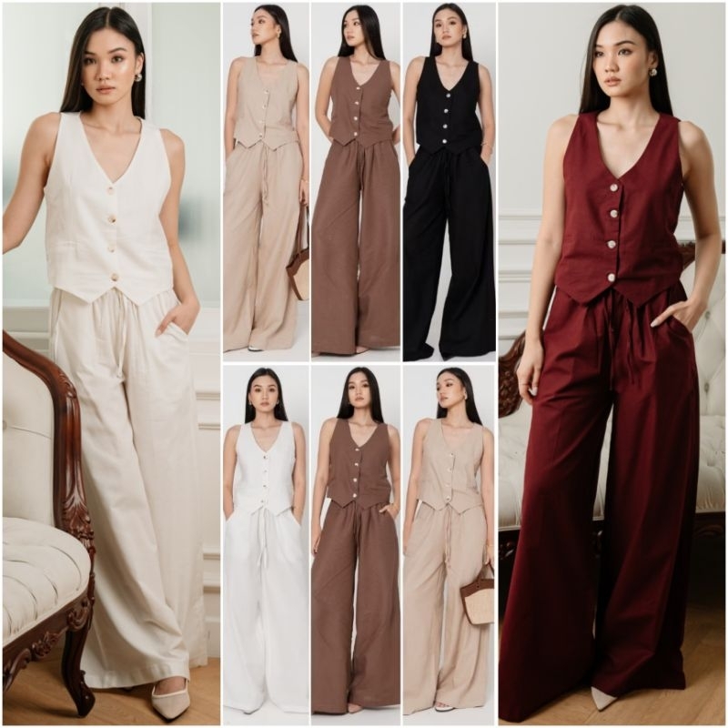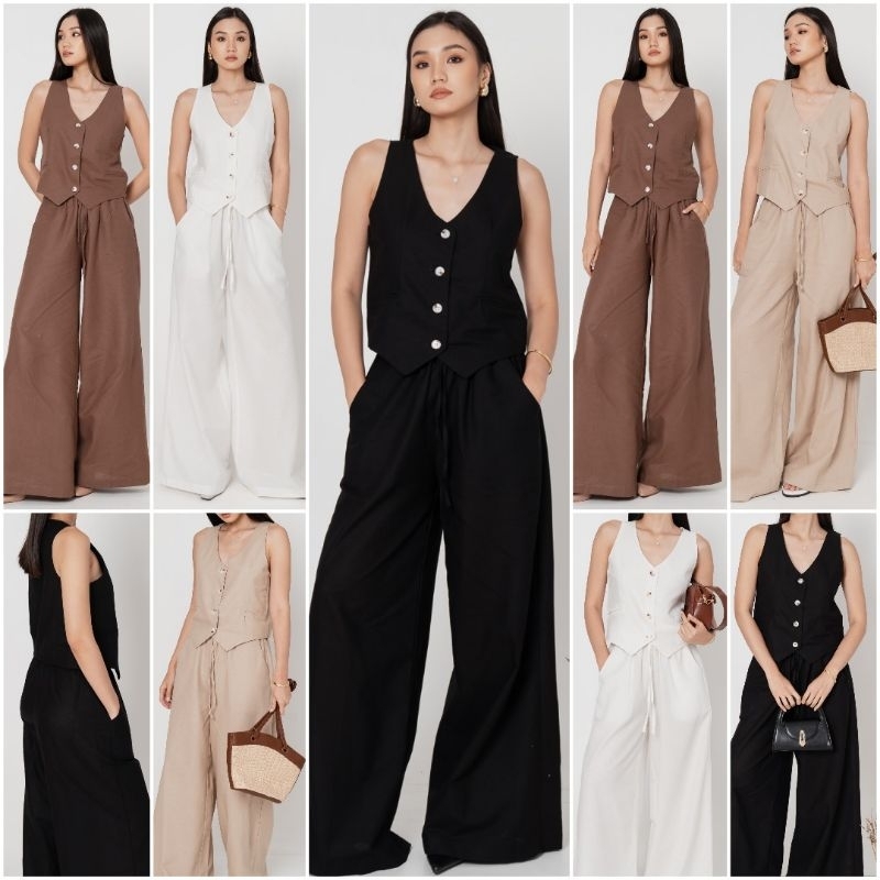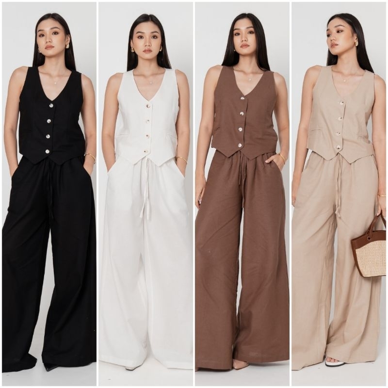 SERAPHINE 2 IN 1 LINEN SET | BUTTON VEST WITH LONG CULLOTE PANTS / SETELAN OUTER ROMPI & CELANA GOMBRONG | SHELICIOUSROO