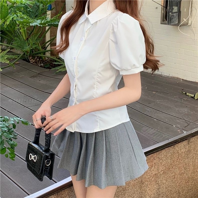 Kemeja Lengan Puff Atasan Kemeja Lengan Panjang Pinggang Tali Putih Kasual Gaya Korea Wanita