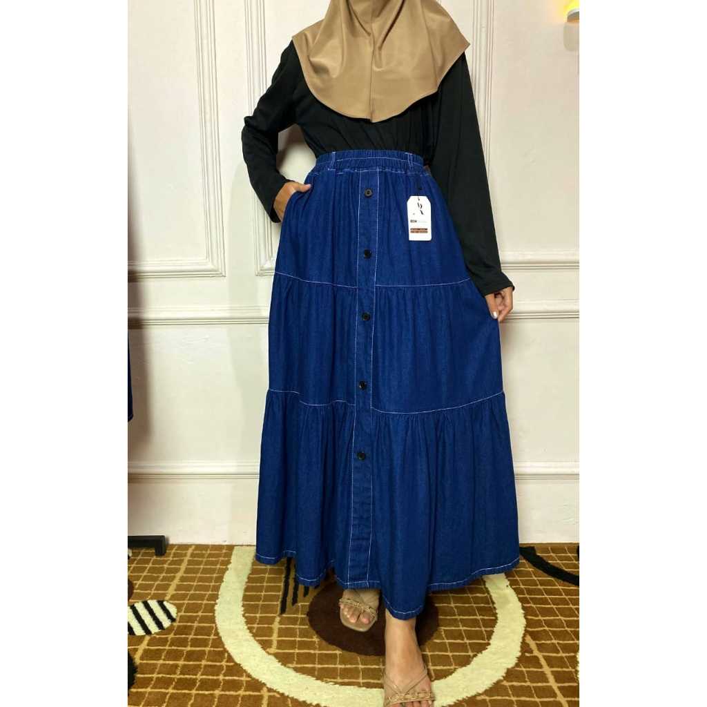 Ruffle A-Line Rok Jeans Skirt Wanita Panjang Tebal Nyaman