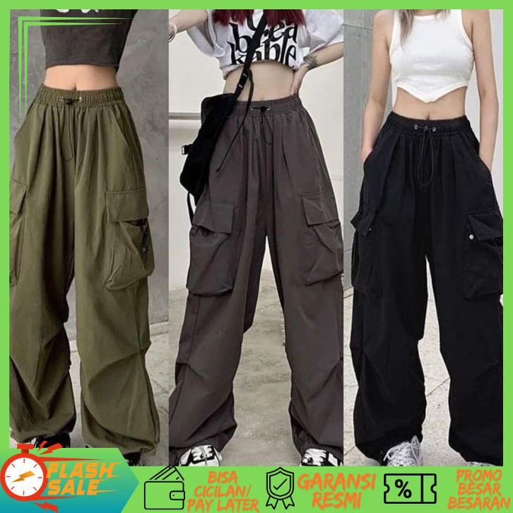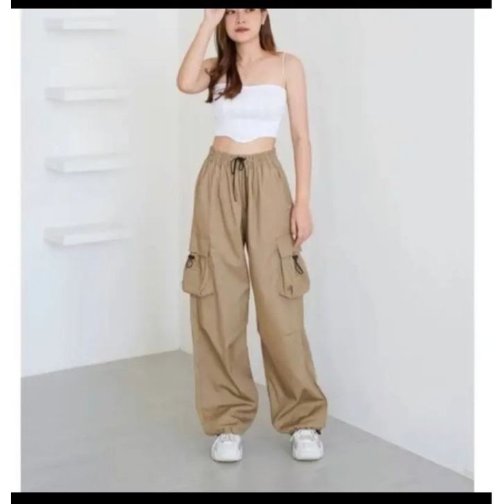 Hstar kiya Cargo Pants Wanita Highwaist Loose korean Style Jumbo Celana Cargo Wanita Kekinian