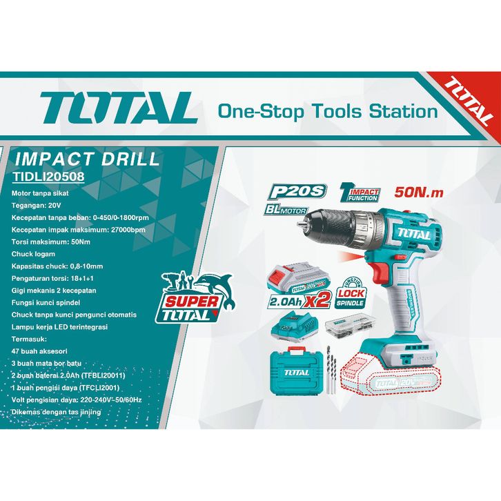 【TOTAL】Bor Impact Baterai Brushless 50Nm/Lithium-Ion Brushless Impact Drill TIDLI20508