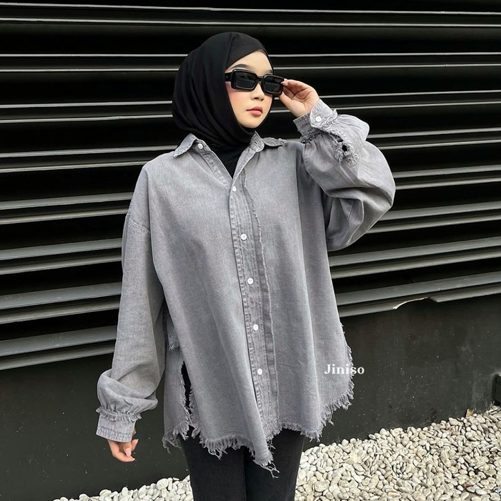 Kemeja Wanita JINISO Kemeja Denim Raw Snow Grey Oversize Unisex HYPER ACTIVE