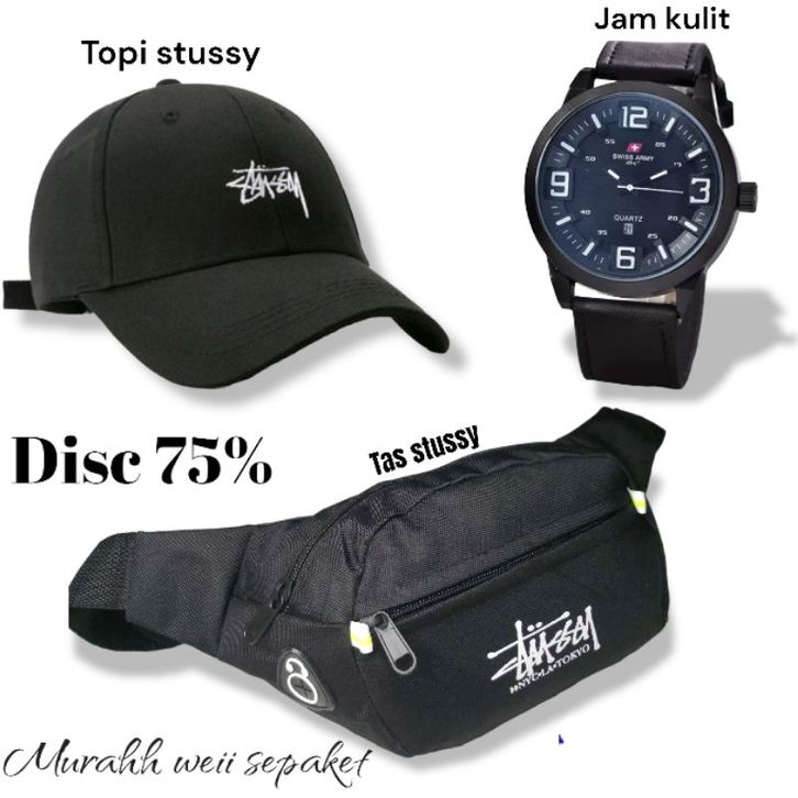 PAKET 4 IN 1 STUUSSY - TAS SALEMPANG KORDURA STTUSSY FREE JAM KULIT ANALOG S.A FREE DOMPET PRIA FREE TOPI STTUSSY - TAS