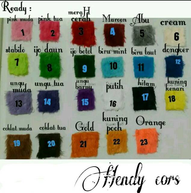 Hijau stabilo, merah cabe, Ungu tua, orange, Krem, abu, Biru mint, Coklat Tua, Biru tua, Gold
