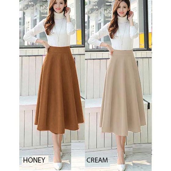 (L083) MID LENGTH FLARE SKIRT (Rok 7/8) midi High Waist Wanita