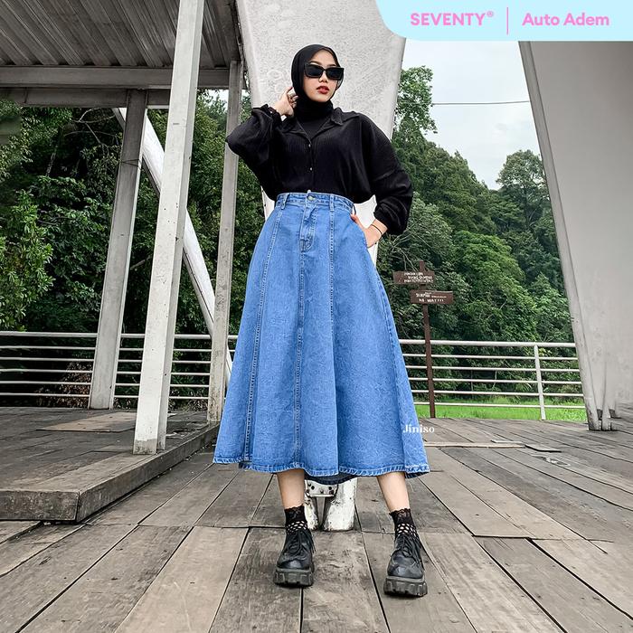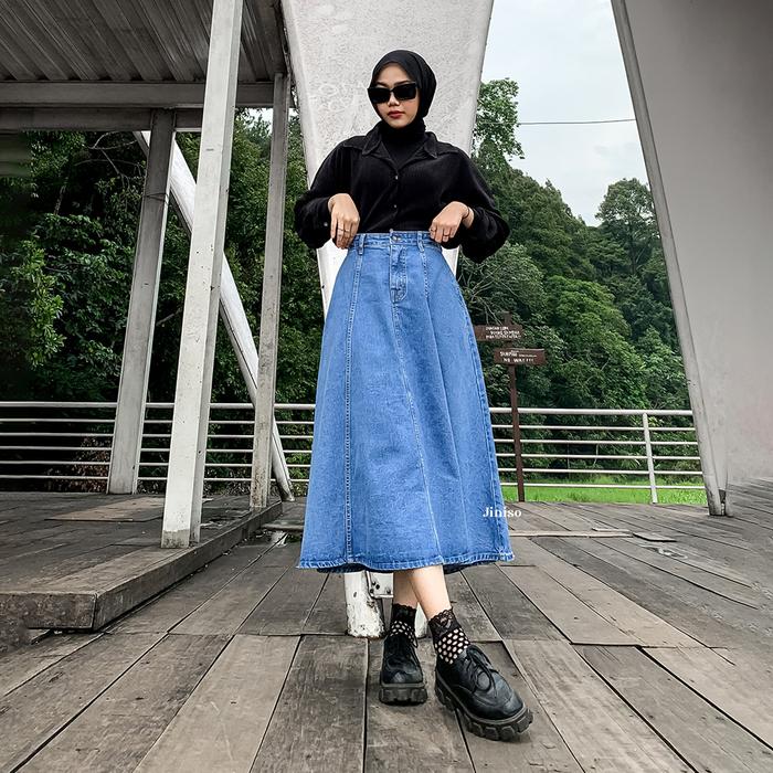 JINISO SEVENTY - 902 A-Line Highwaist Rok Jeans Wanita Warna Blue
