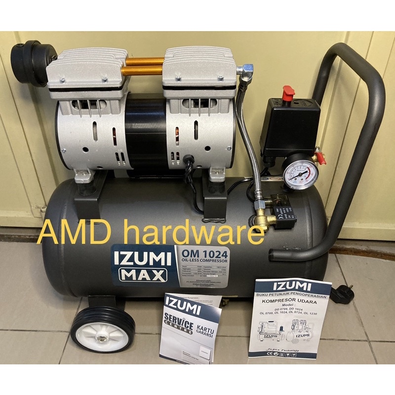 PAKET NGECAT & ISI ANGIN KOMPRESOR 1HP IZUMI OL1024 /OM1024 Tangki 24L COMPRESSOR OILLESS SILENT +SPRAY GUN + SELANG Rec
