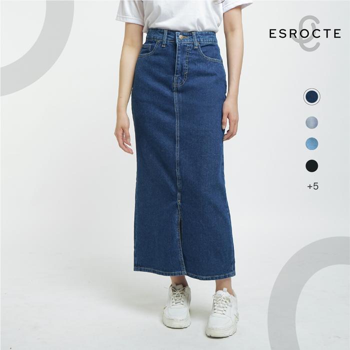 ESROCTE Rok Midi Denim skrit Mid Waist Panjang Jeans Wanita/Cewek P65 - Biru 26-38 001