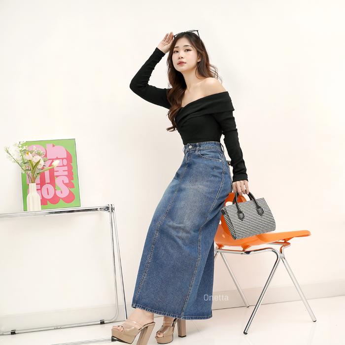 Onetta - OLIVIA (Dark Blue Scrub) - Rok Jeans Panjang Berhijab Tebal Basic High Waist Wanita