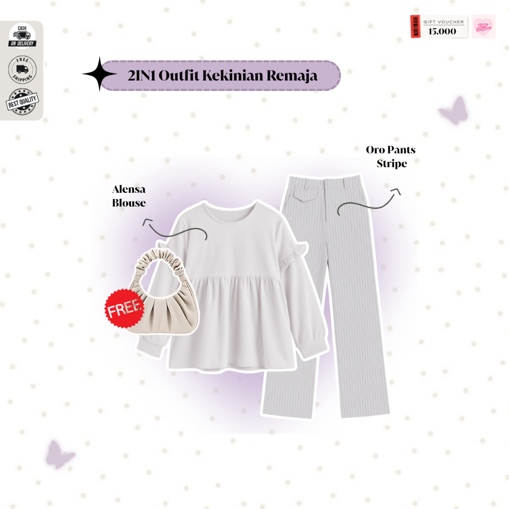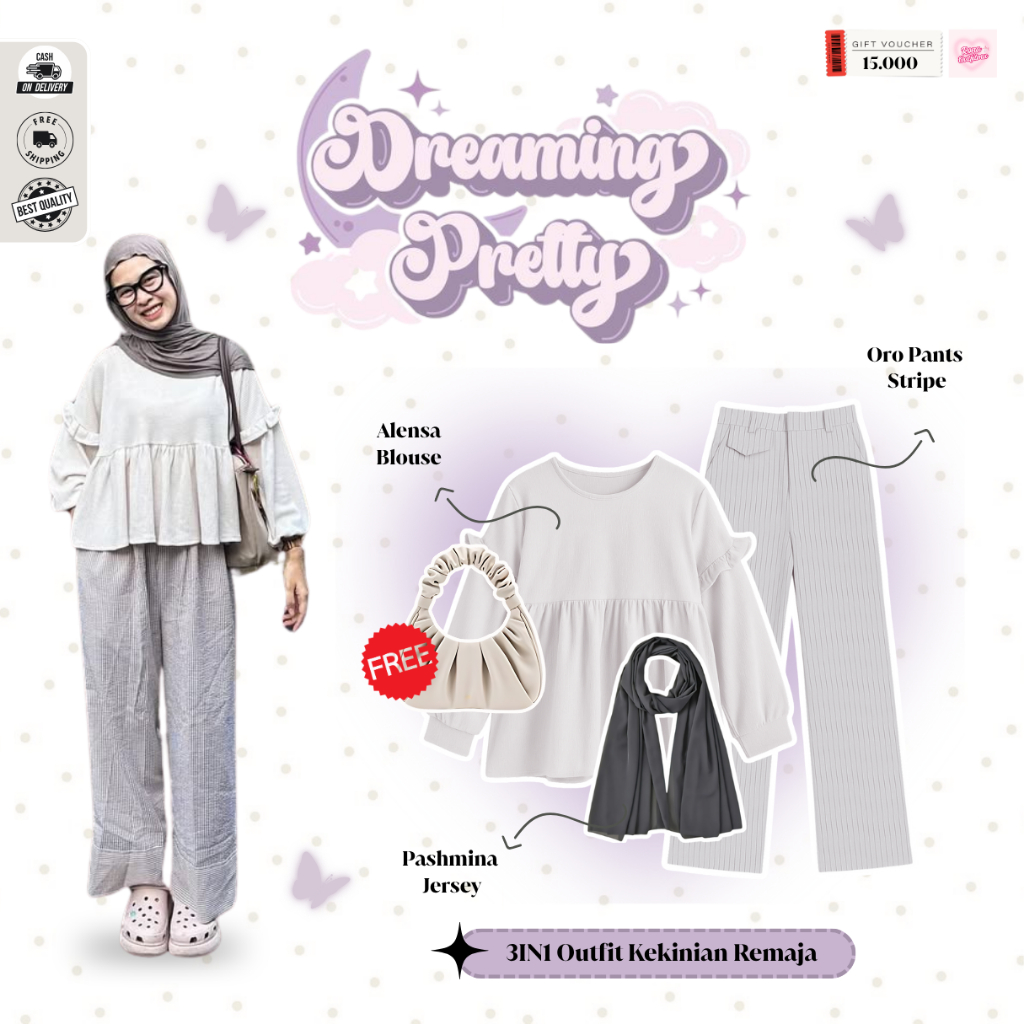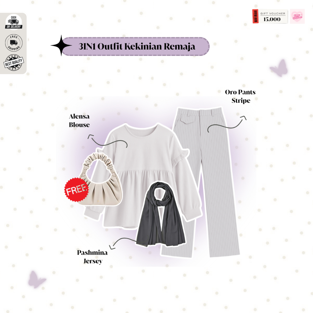 Rona - Outfit Simple Kekinian Wanita | Pashmina Jersey Abu, Alensa Blouse Ivory, Oro Pants Sripe Putih | Ootd Kekinian