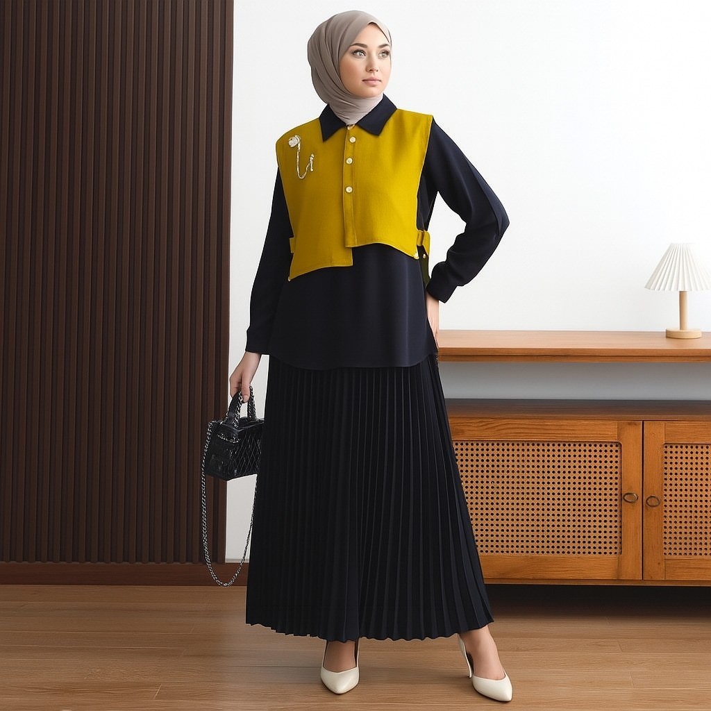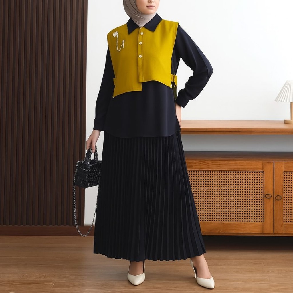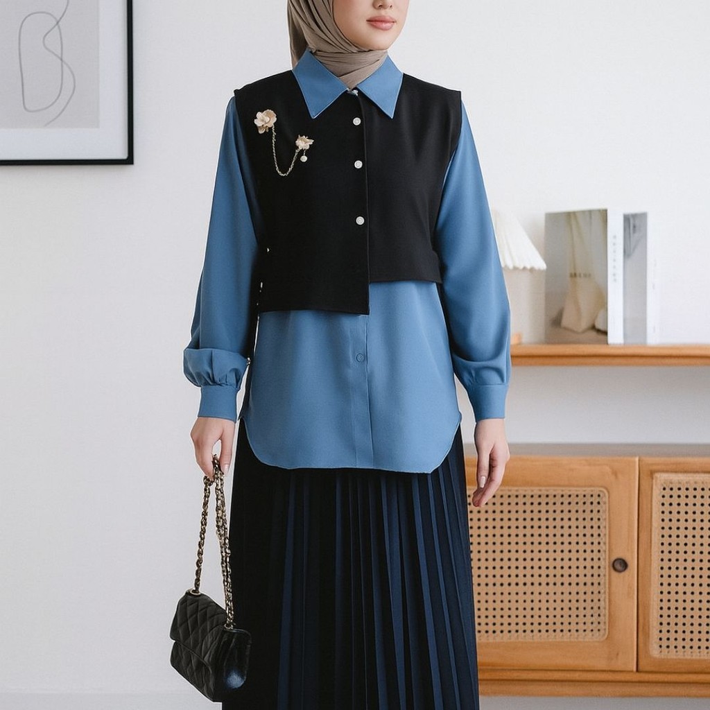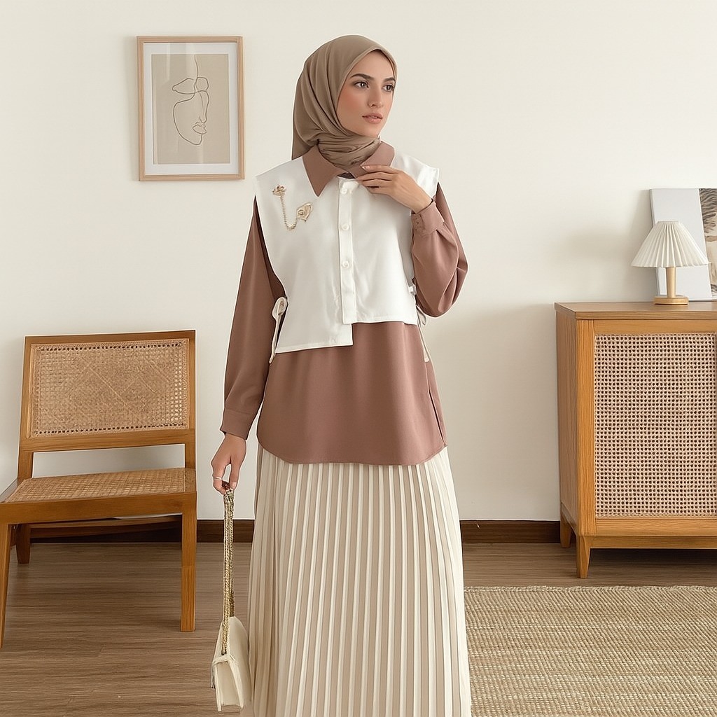 Vallina Outfit - Lana Kemeja Atasan Wanita 2in1 Modern Kekinian Matt Polo Linen Premium OOTD Korean Style