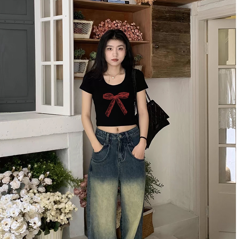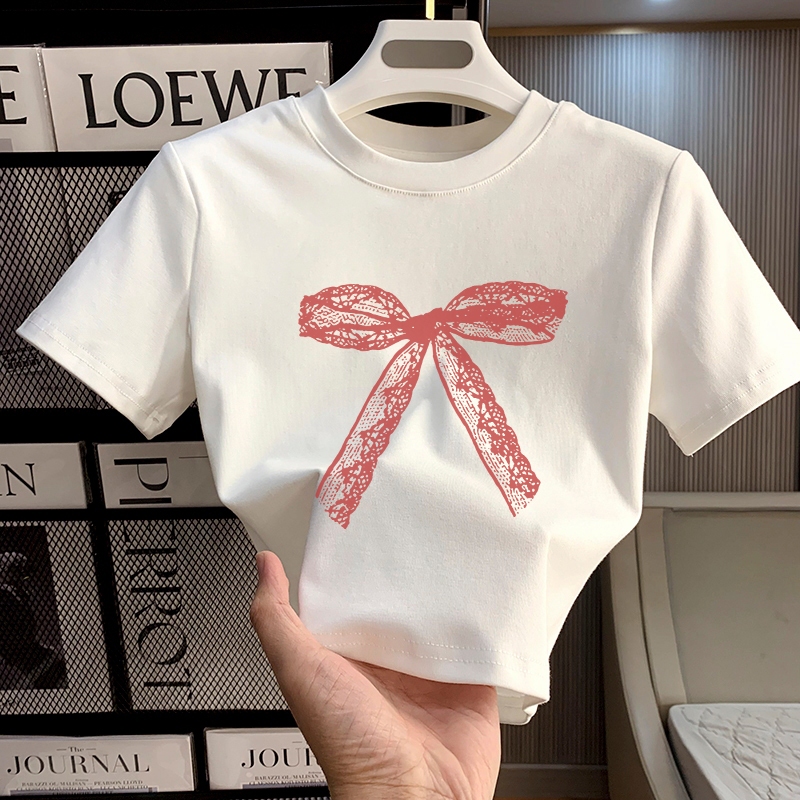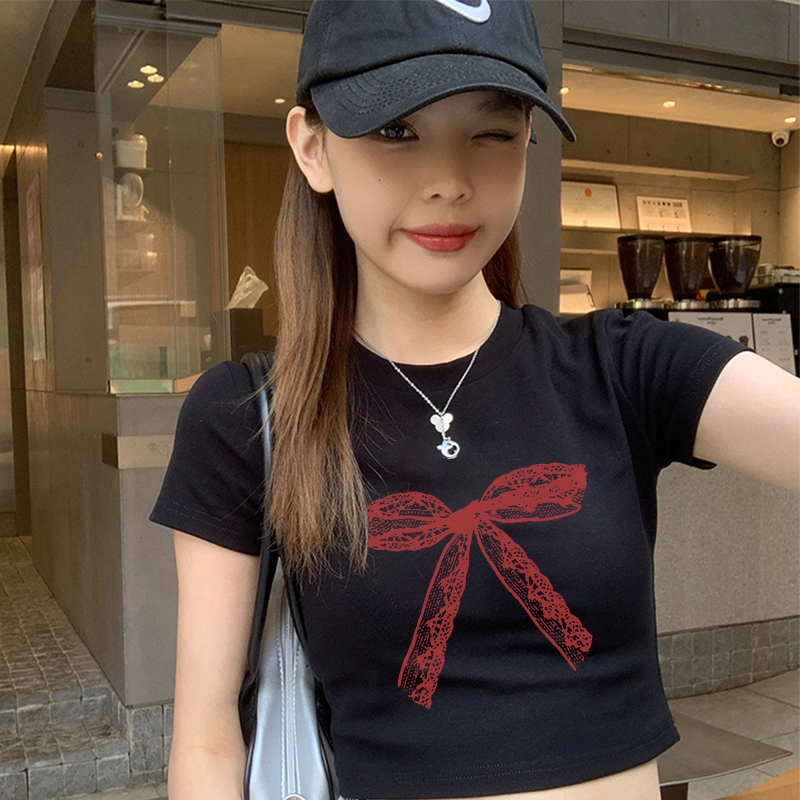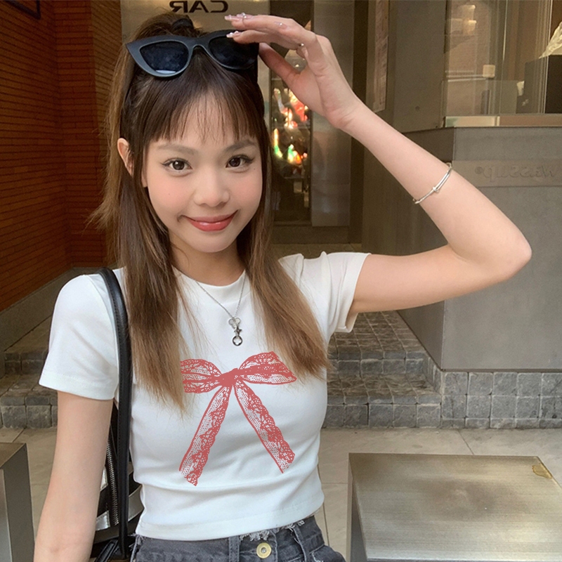 【LYBH STORE】Premium Baju Pendek Wanita Crop Top Ketat Putih Polos Wanita Korea - Busur Merah Print - Street Style Baju B