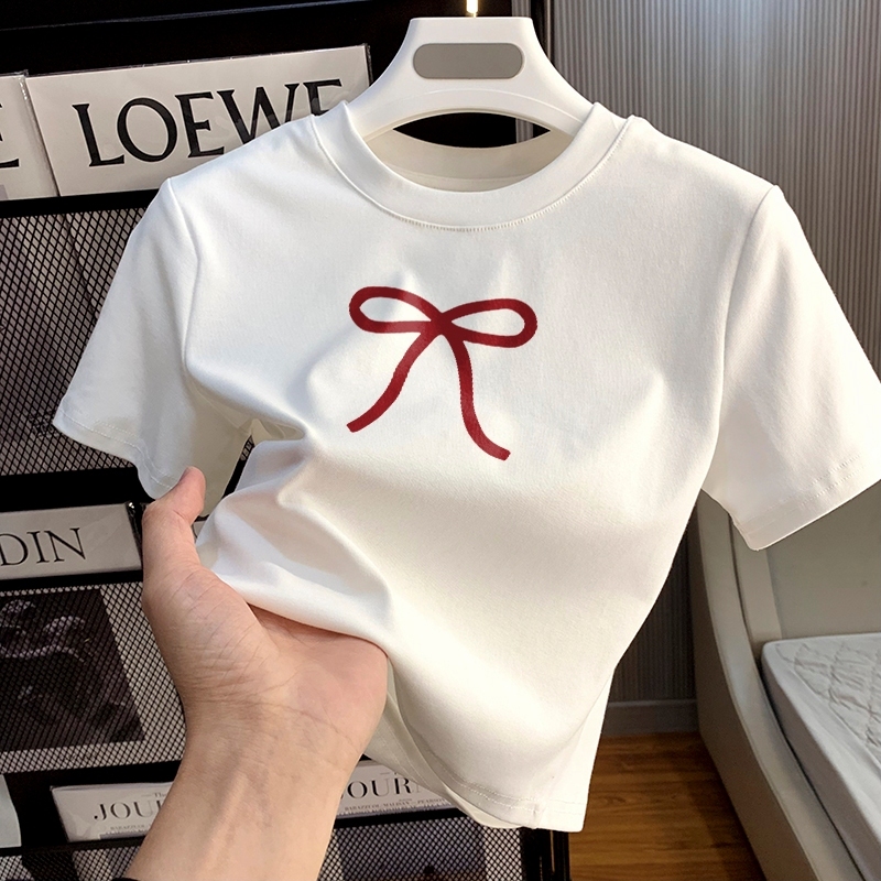 DSSTORY T-shirt Crop Top Lengan Pendek Kaos Wanita Crop Top Red simple bow Kaus Crop Wanita Baju Atasan Wanita Terbaru P