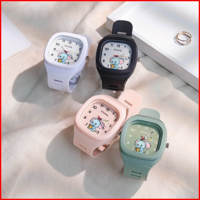 3pcs Set Jam Tangan Kuarsa Anak Tali Silikon Kartun Gajah Dial Persegi Gelang Mode Dengan Kotak Hadiah