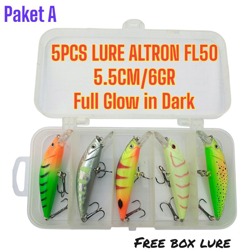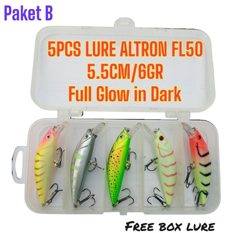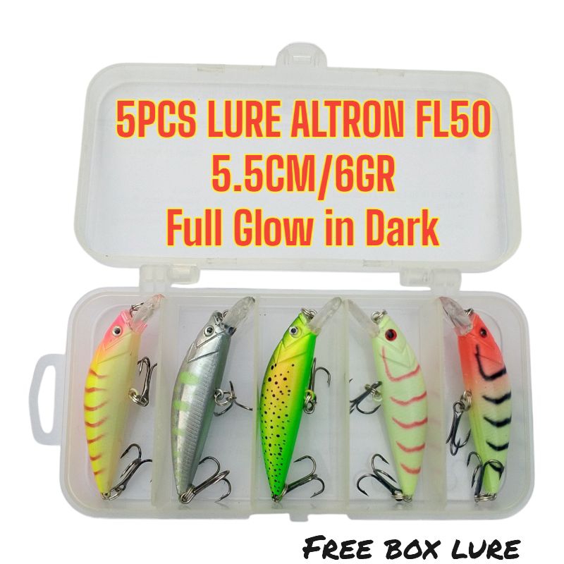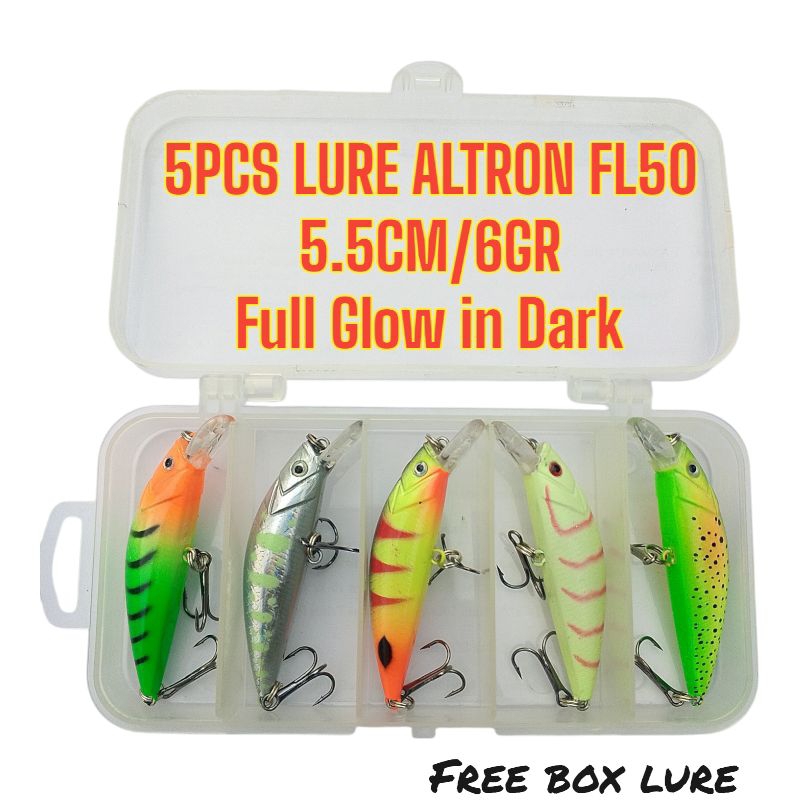 5PCS PAKET UMPAN PANCING LURE CASTING ULTRALIGHT ALTRON FL50 FULL GLOW IN DARK FREE BOX LURE