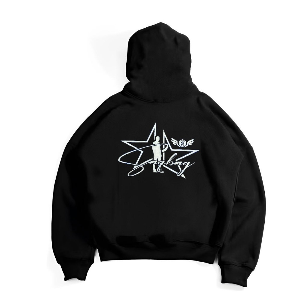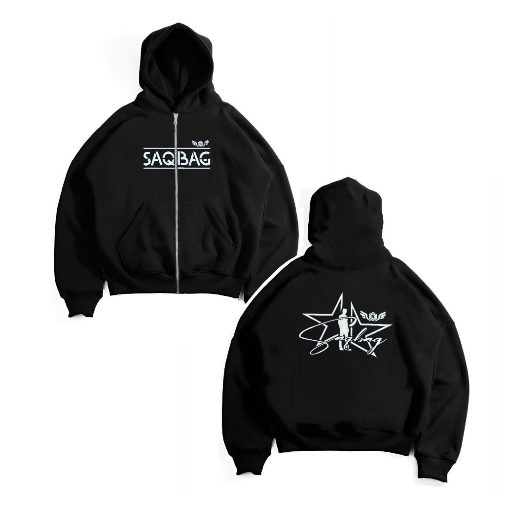 Jaket Sweater Hoodie Boxy Zipper STAR SAQBAG Warna Hitam Unisex Pria Wanita Memakai Resleting