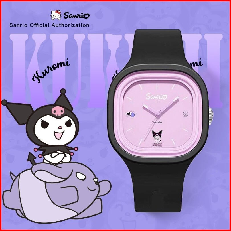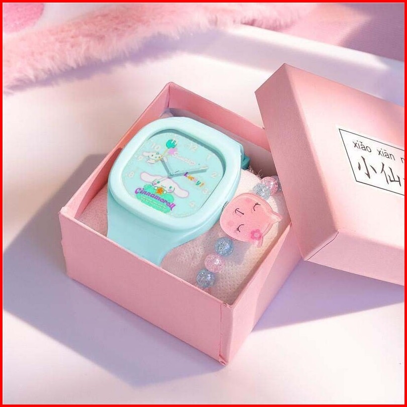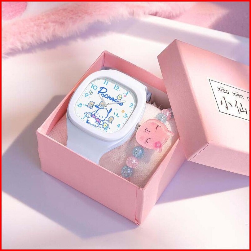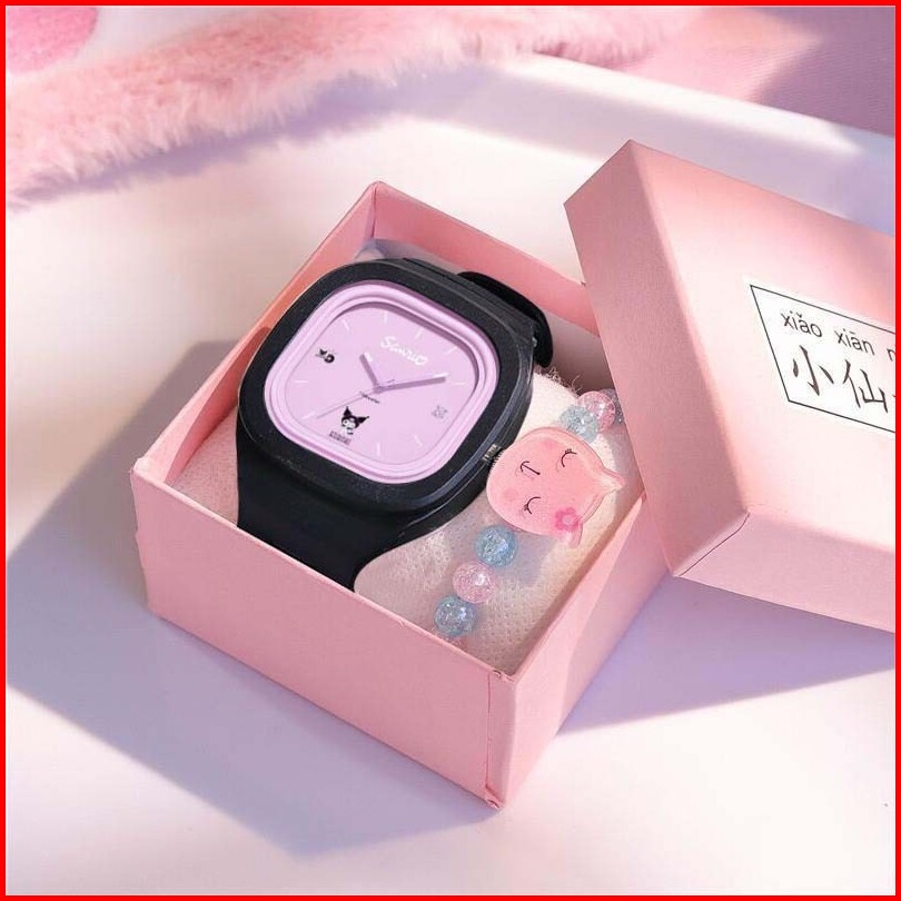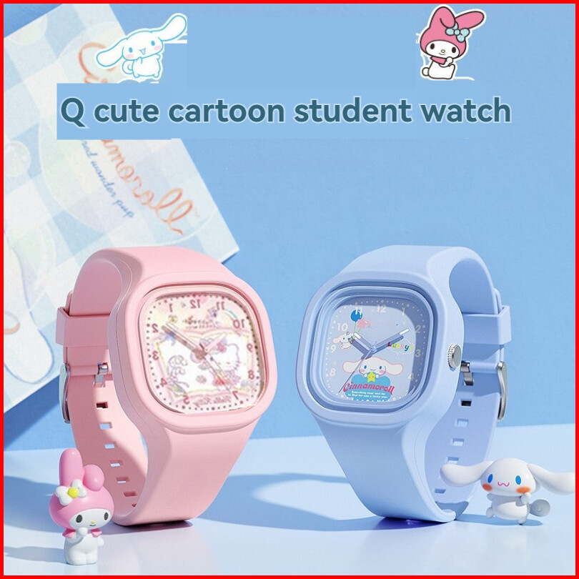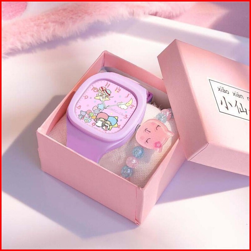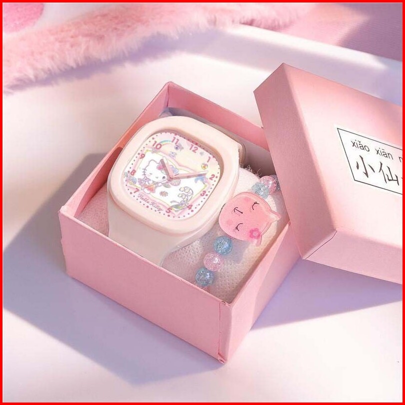 3pcs Jam Tangan Kuarsa Anak-anak Kuarsa Lucu Hello Kitty Square Dial Silicone Dengan Gelang Hadiah Ulang Tahun Dengan Ko