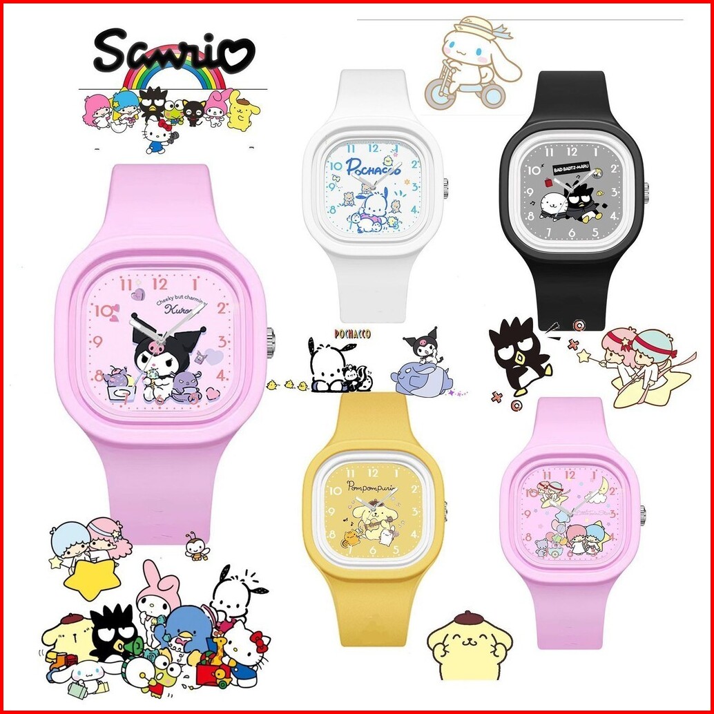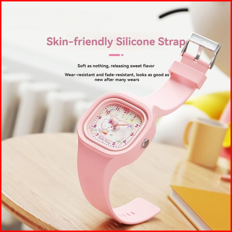 Jam Tangan Kuarsa Anak Hello Kitty Kartun Lucu Dial Persegi Tali Silikon Jam Tangan Warna Permen