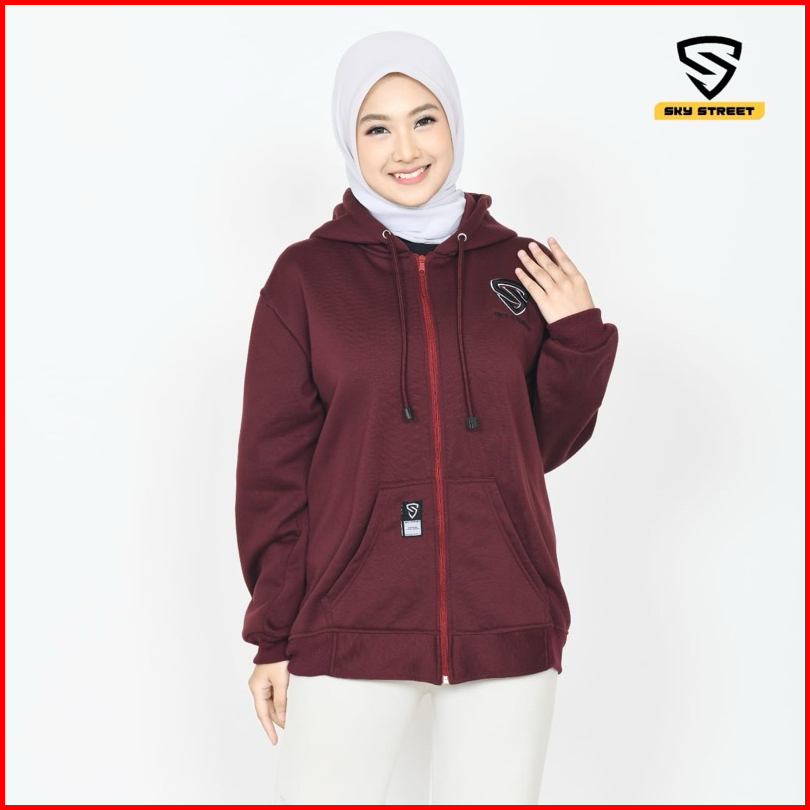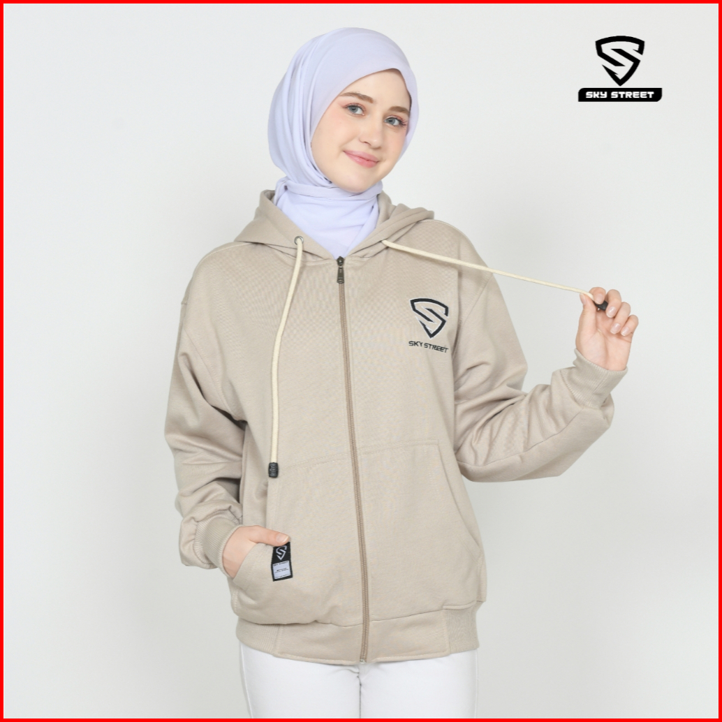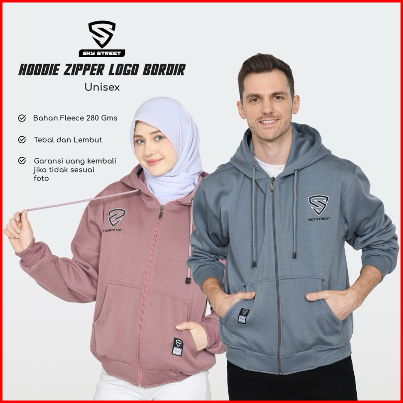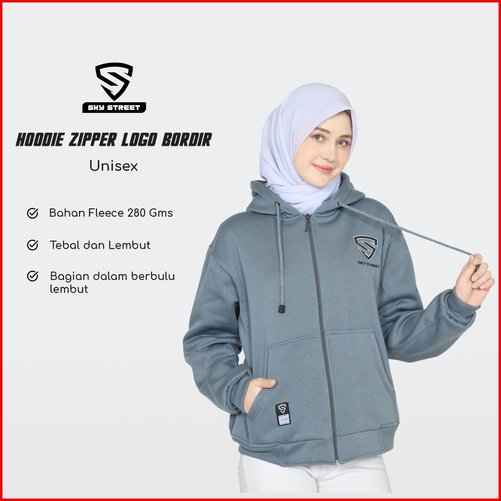 Sky Street Hoodie Sweater Jacket Zipper Resleting Logo Bordir 280 Gms Tebal Lembut Unisex Pria Wanita Bahan Fleece Distr
