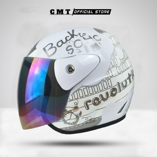 helm wanita dewasa keren kyt Helm Half Face Evo Motif Note Revolution Kaca Pelangi Silver Hitam/Helm Half Face Kekinian