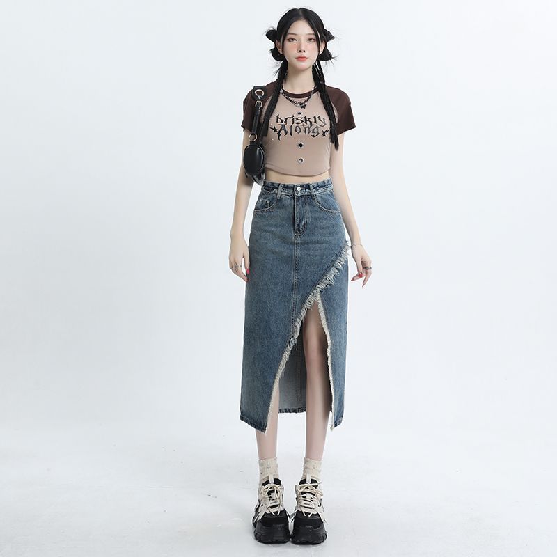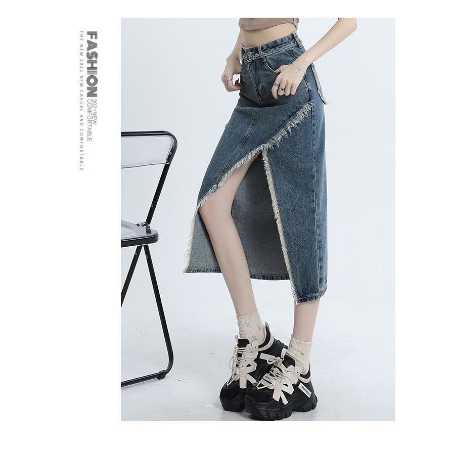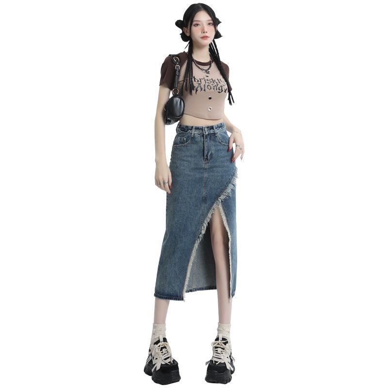 Rok Jeans Panjang Tinggi Pinggang dengan Detail Kulit Sapi - XS/S/M/L/XL