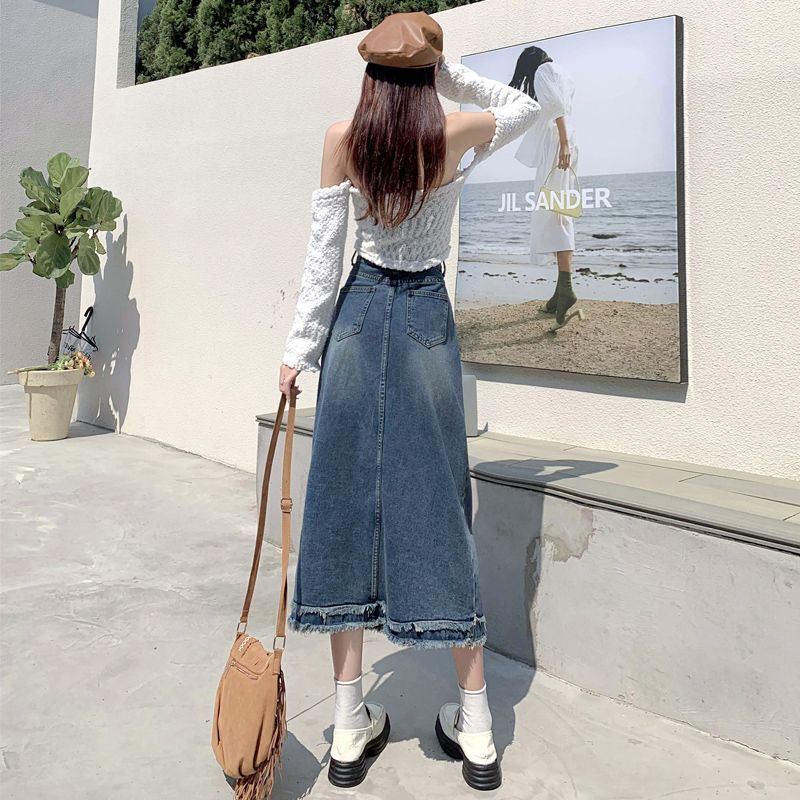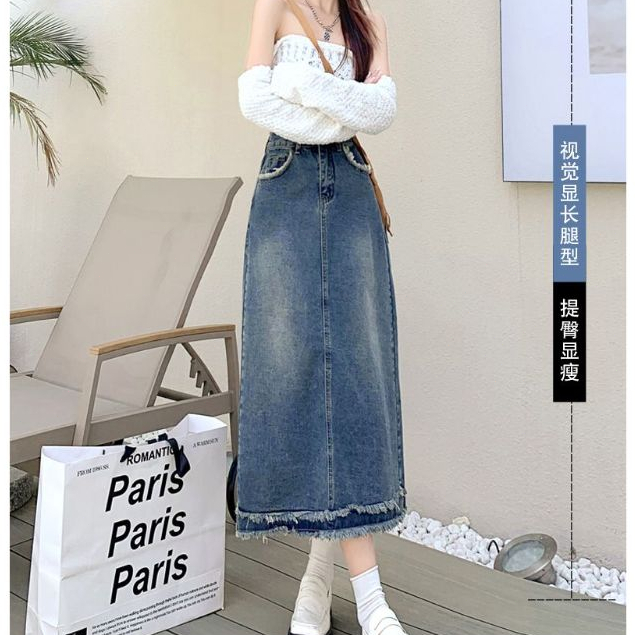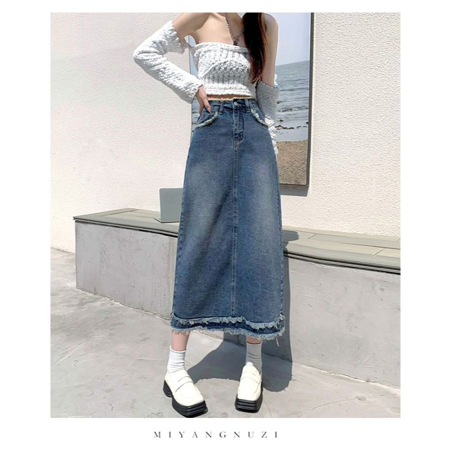 Rok Jeans Korean Retro High Waist Biru Navy Potongan A-Line Bodyhugging Tipis Mid Calf Langsing Natural