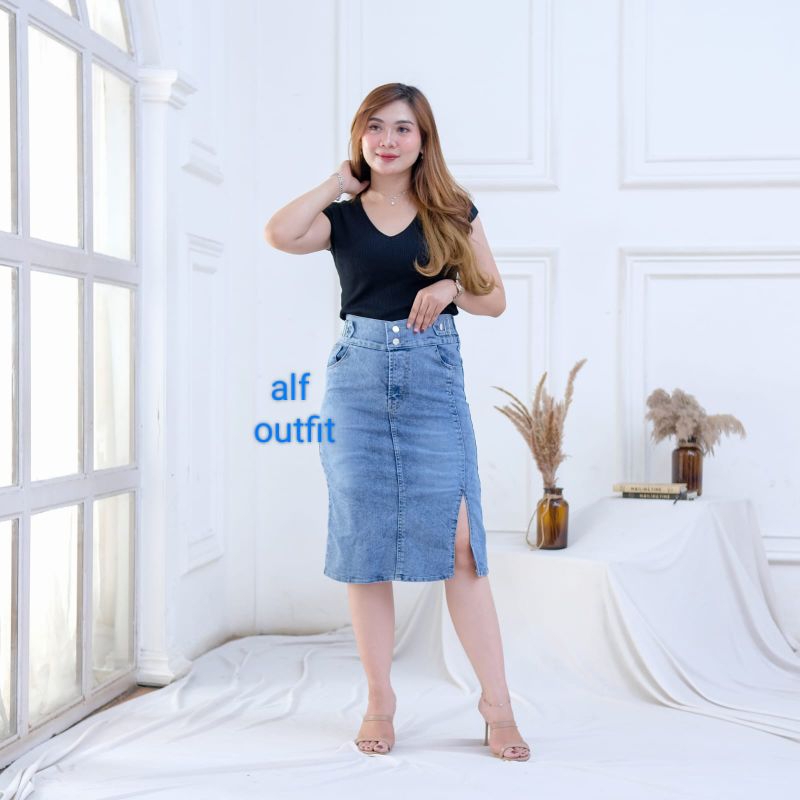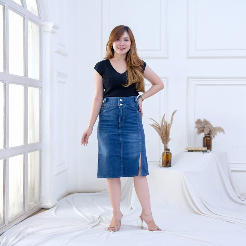 Rok jeans higwaist A-Line panjang 7/8 belah samping pinggang karet korean style