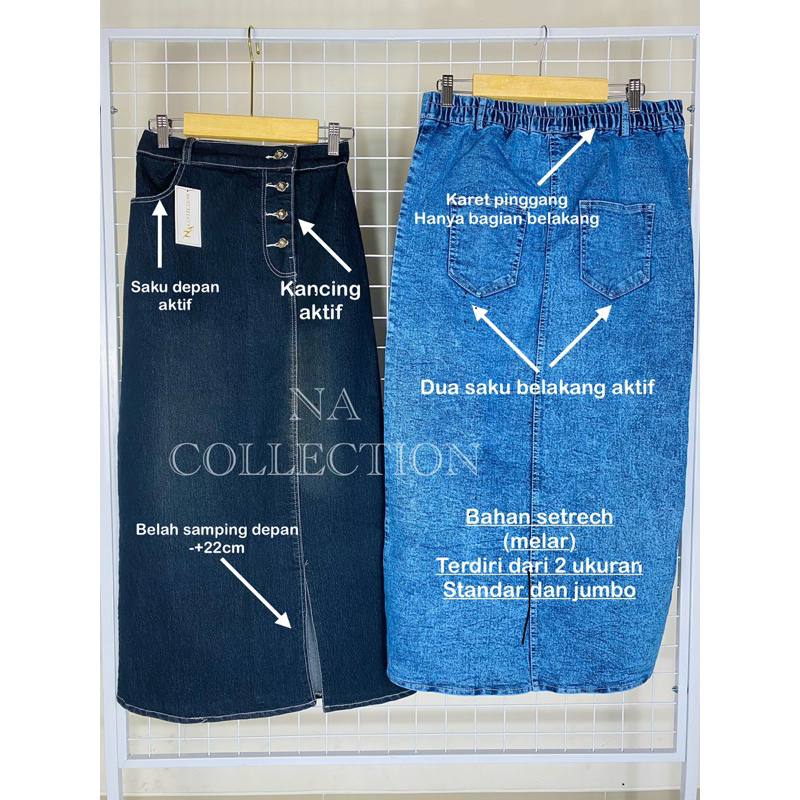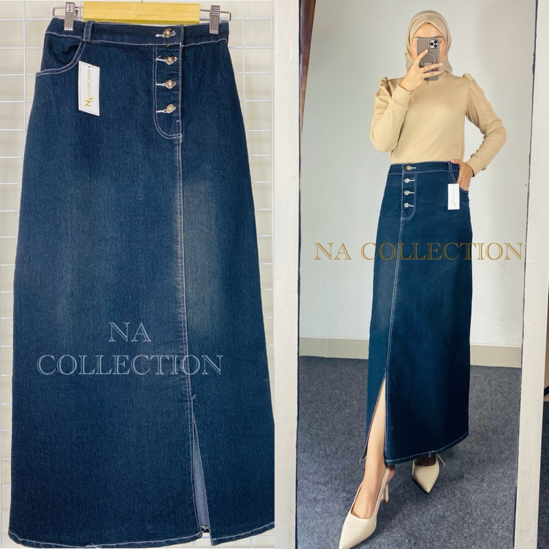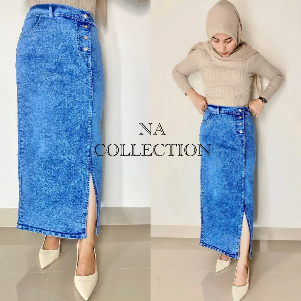 rok jeans belah samping kancing depan bahan denim tebal setrecht pinggang karet kekinian korean style