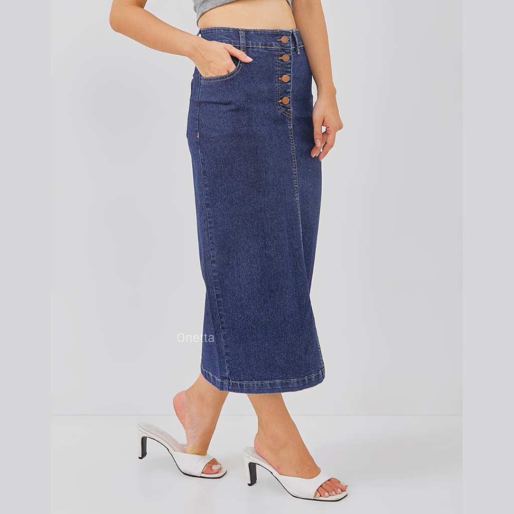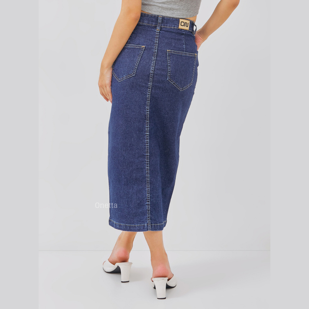 Onetta - Rok Jeans Wanita 7/8 LARISSA Midi Skirt Dark Blue