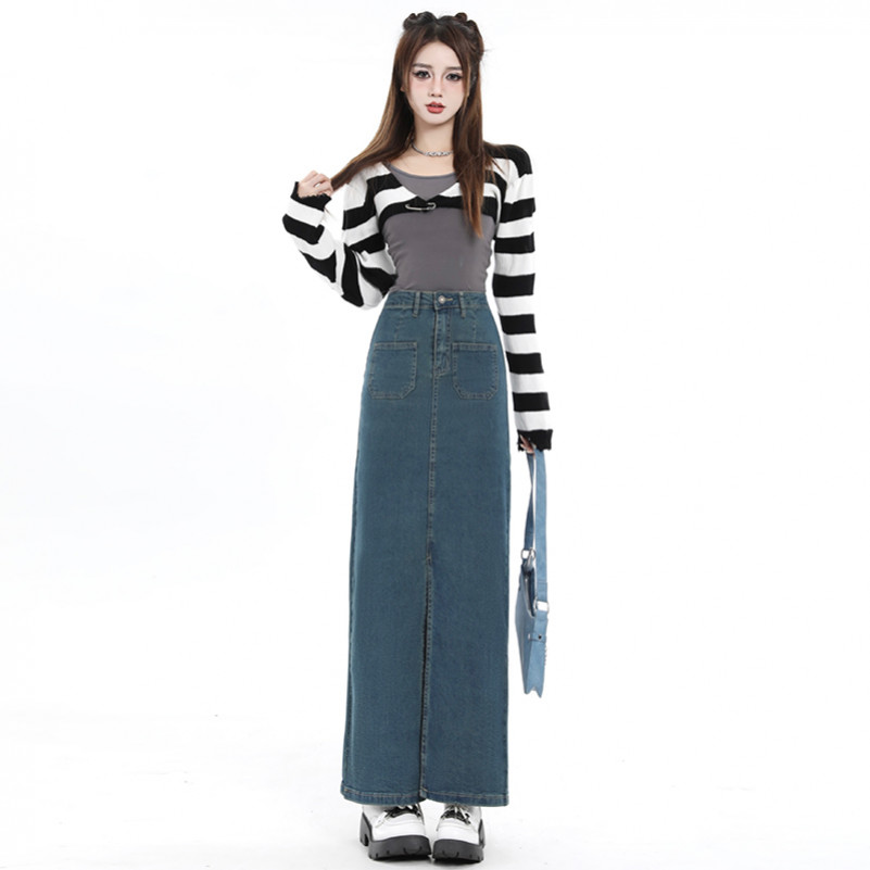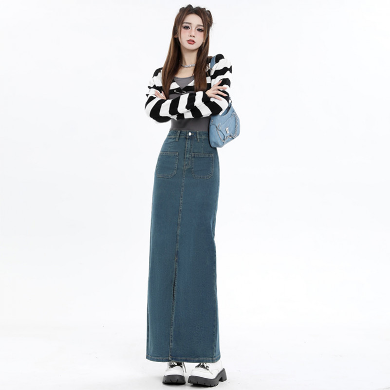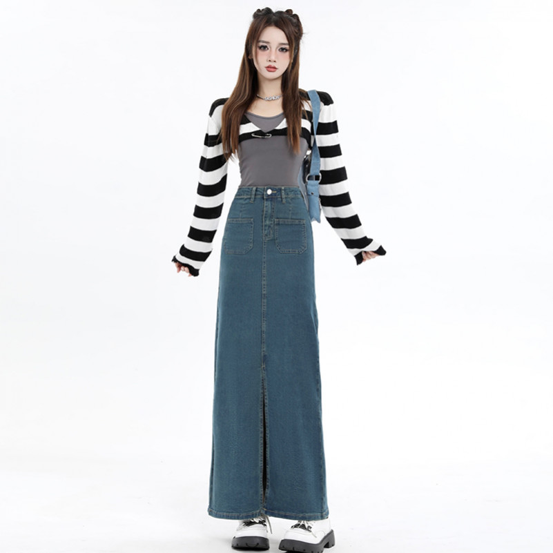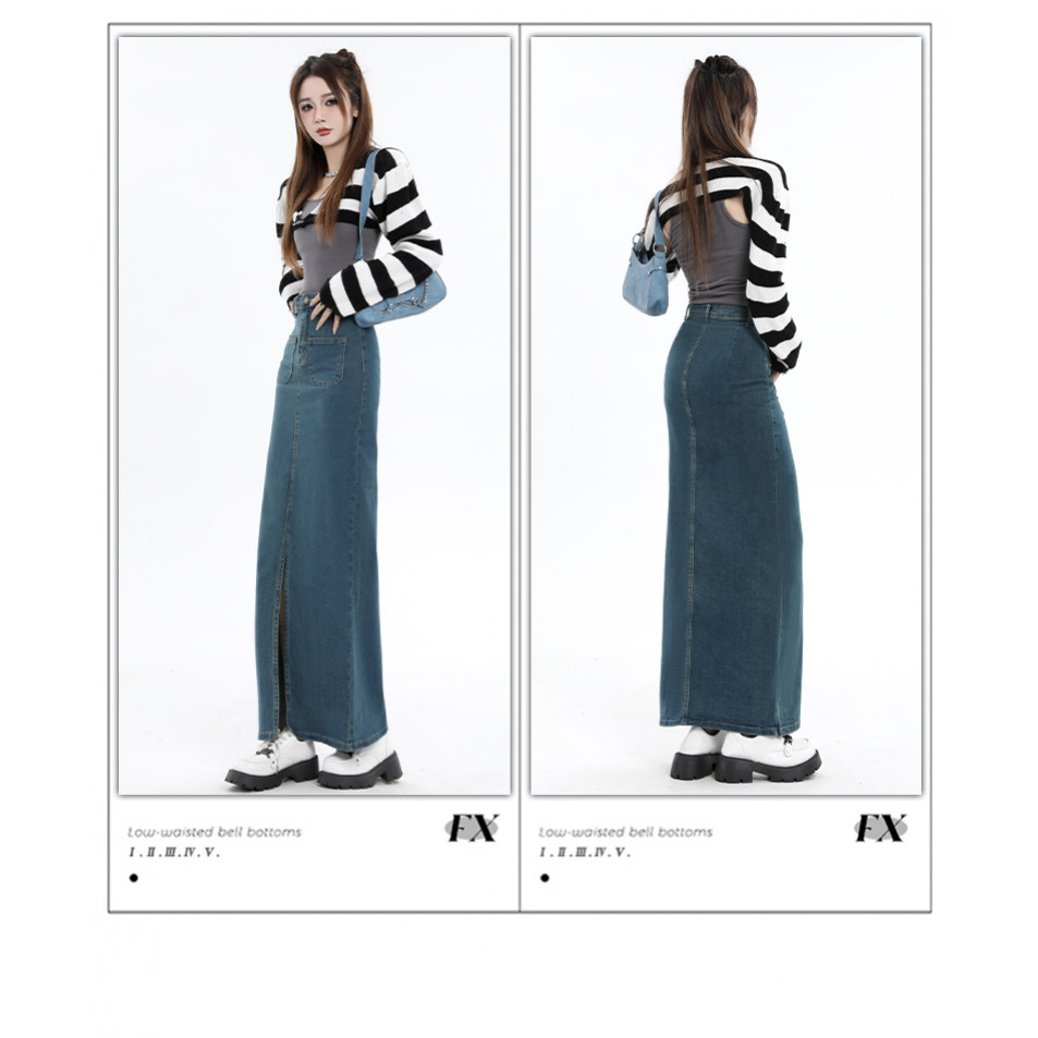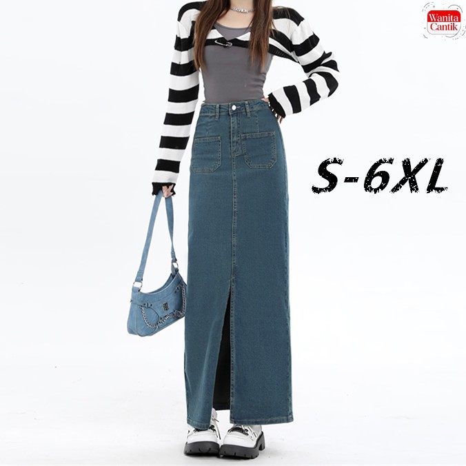S-6XL Rok Jeans Denim Wanita Korean Style High Waist Rok A-Line Panjang Elegan Kasual Terbaru Belahan Depan Slim Fit Rok