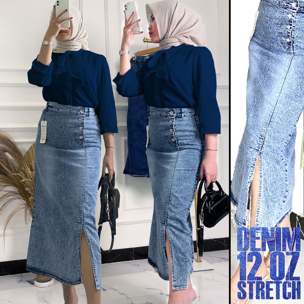 Rok Jeans Wanita Highwaist Span Belah Depan, Rebecca Denim Stretch Korean Style Allsize Lp 70-105 cm