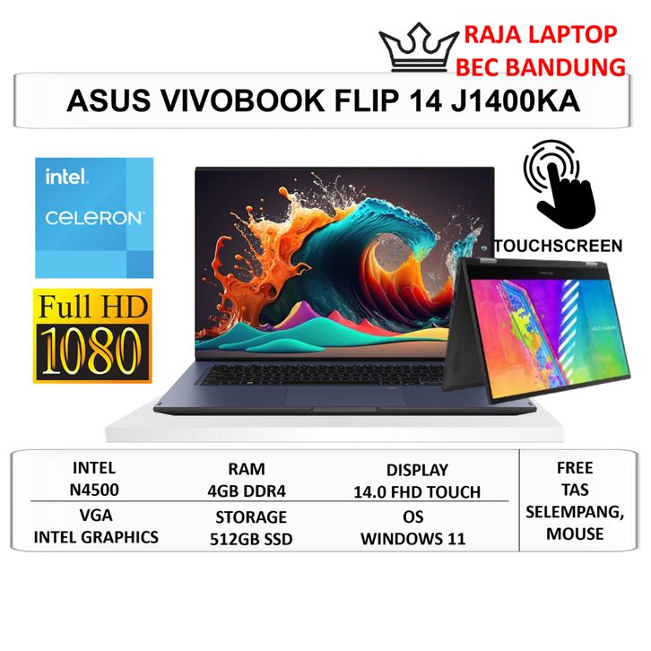 Laptop Touchscreen 2in1 Asus book Flip 14 J1400KA Intel N4500 Ram 4GB SSD 512GB 14" FHD Win 11