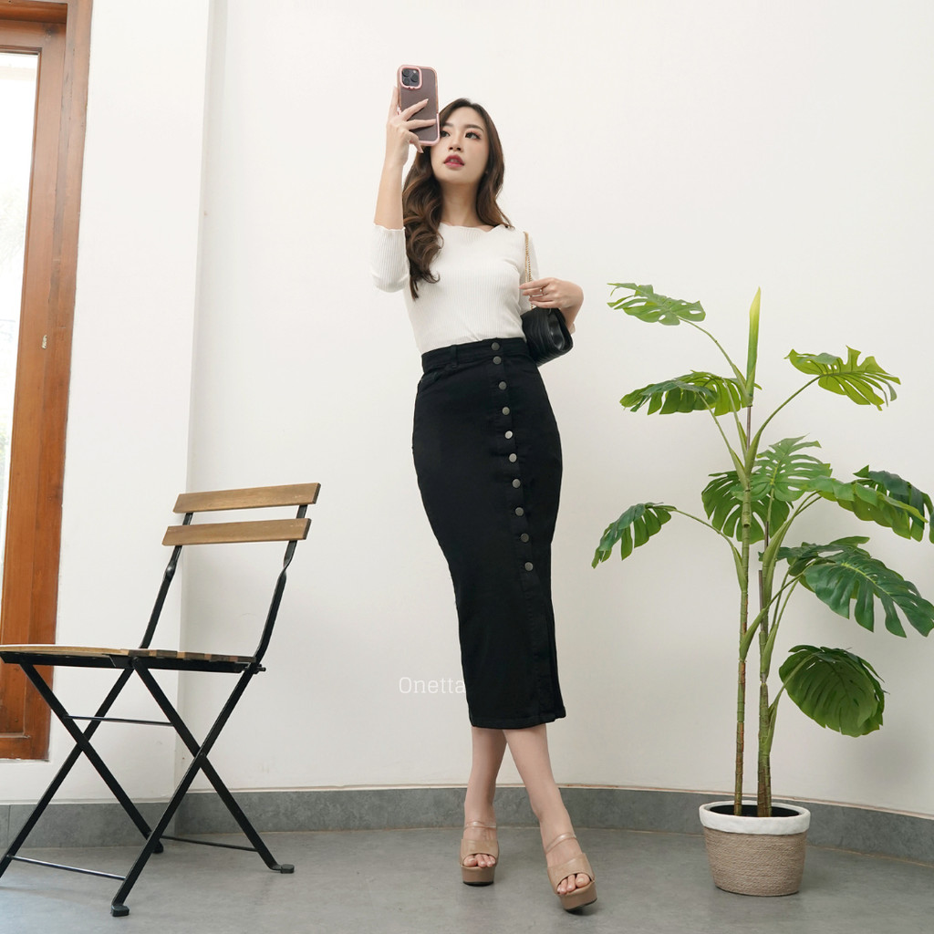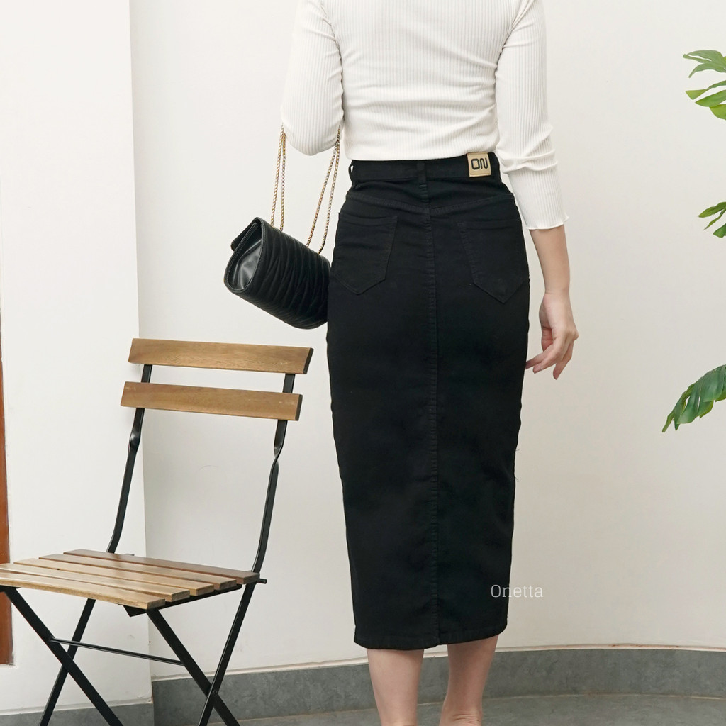 Onetta - Rok Span Jeans Hitam Midi Wanita Full Kancing ELOISE BLACK