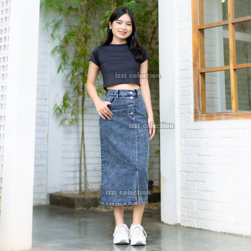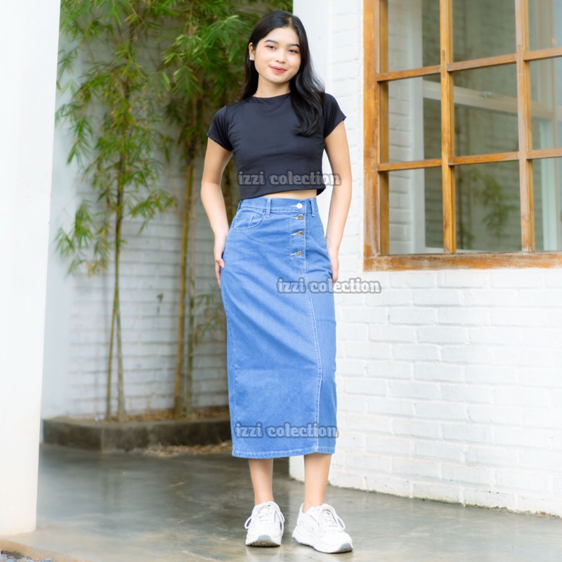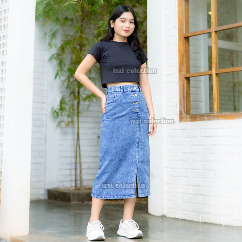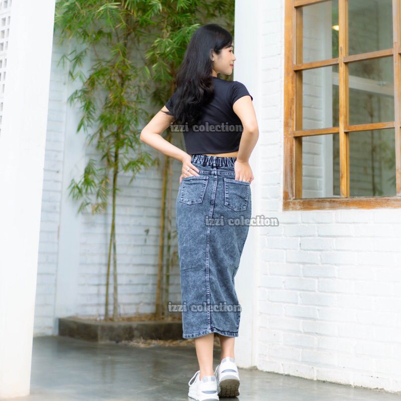 Rok Jeans Midi 7/9 Tessel Wanita Skirt Highwaist Jeans Stretch Mulur Panjang 80cm Jumbo Belah Depan