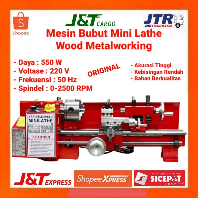 Mesin Bubut Mini Lathe Wood Metal Working Making 550W 220V CJ0618 Elmazhgang Alat Potong Acrylic Plastik Aluminum Copper