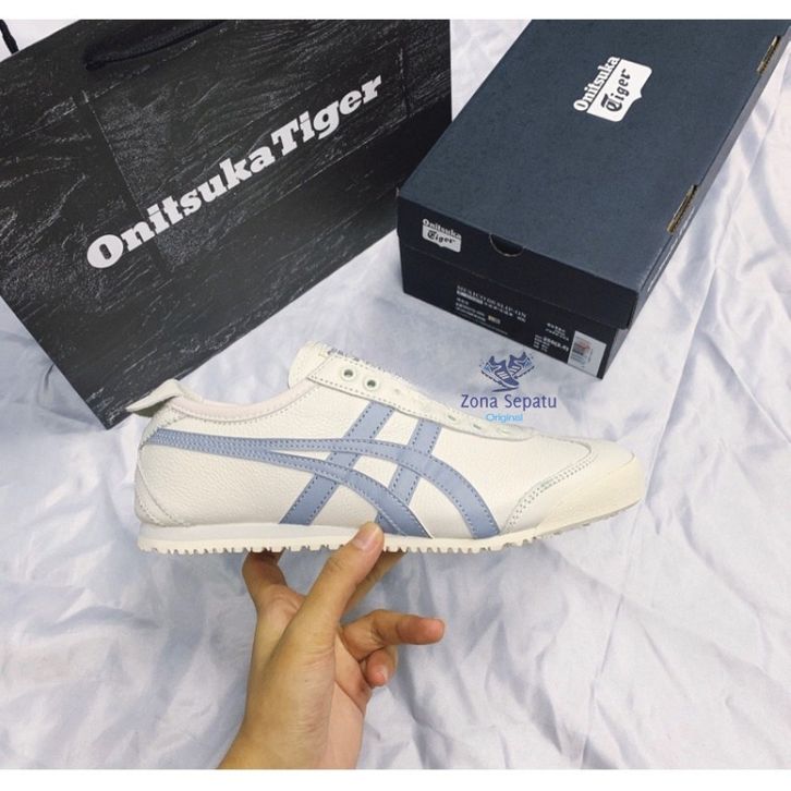 Sepatu Sneakers Casual Onitsuka Tiger Leather Slip-on Cream Blue Original Pria Wanita Free Paperbaq dan Kaos Kaki